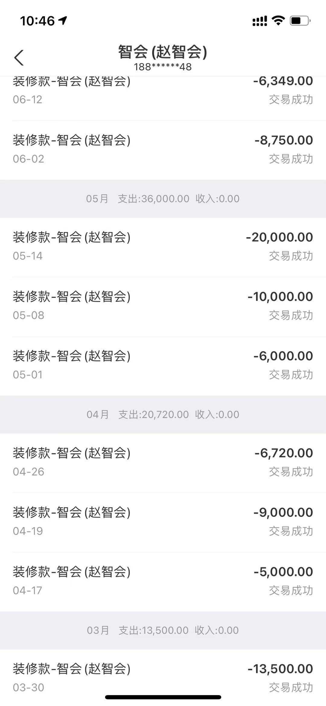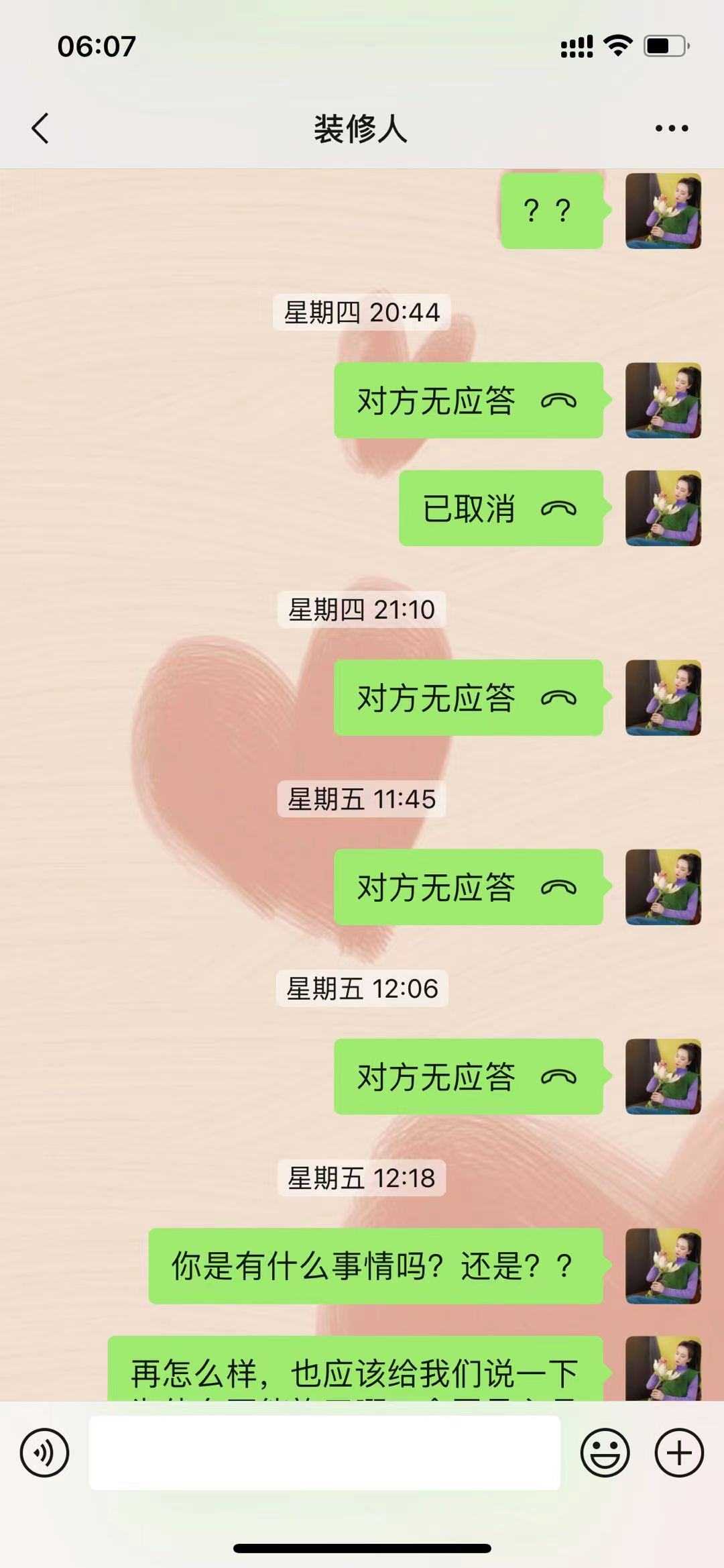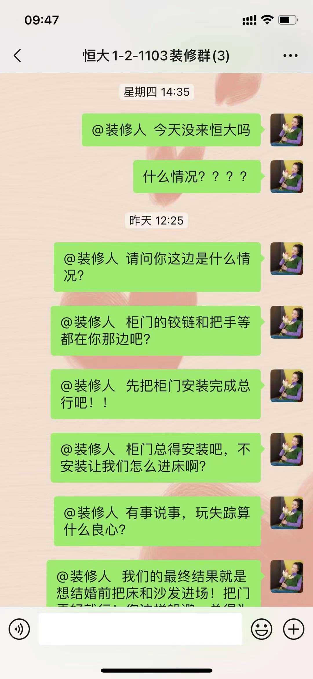 我们于2021年3月30日与南京毕升建筑装饰有限公司的法定代表人 赵智会(身份证号码:32088219870202121X)签署了装修合同,合同期限3个月。截止今日,装修事宜未完成,目前剩余房门,厨房、卫生间门、橱柜门没有安装,也没有送货。负责人赵智会一直处于不回复信息不接电话的失联状态,期间我们多次催促,他以各种理由拖延,后因为疫情期间无法见面,疫情过后就再也联系不上了。