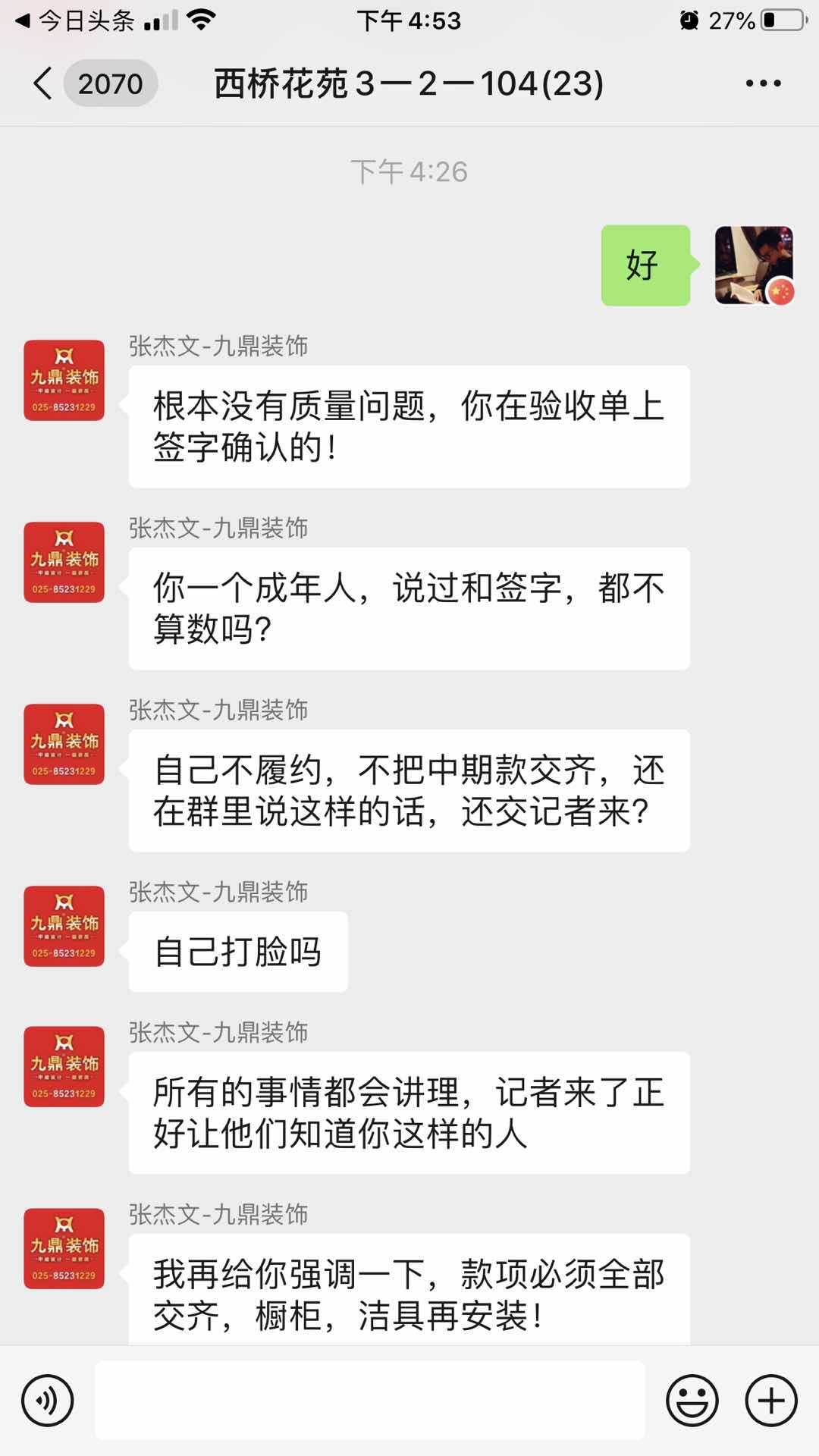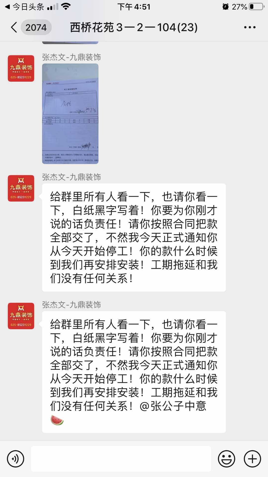 | 投诉类型 | 拖延工期 | 投诉人 | 张** | 被投诉单位 | 南京九鼎恒美装饰工程有限公司 |