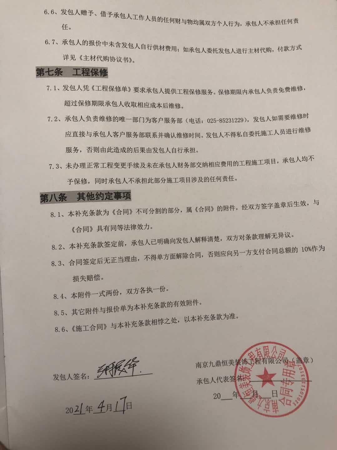 九鼎装饰负责人回复:按合同条款执行,不支付费用不施工。维权站要求双方再次沟通协调处理,写书面的协调协议。装修公司表示已经沟通过,不退让,一再要求支付费用。建议消费者走其他渠道处理。 | 2021-10-12 |