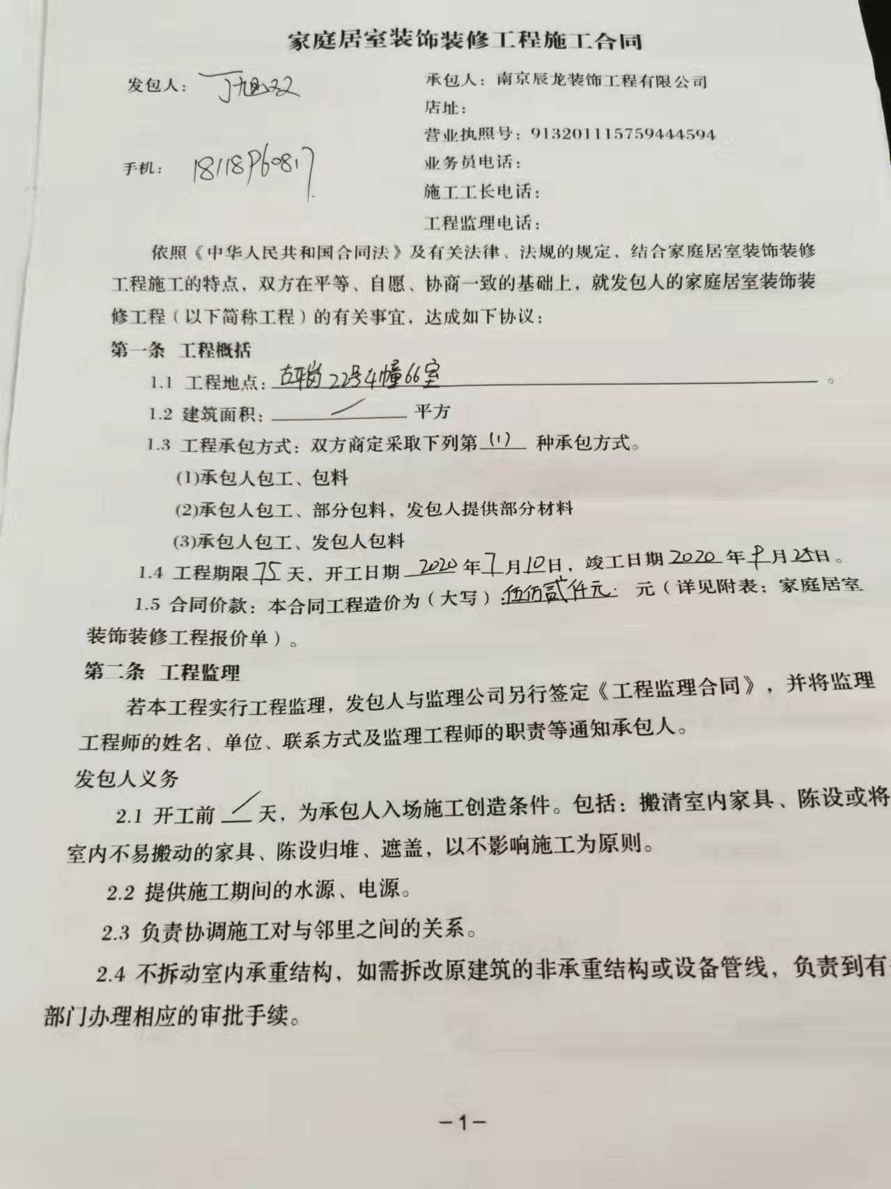 我古平岗22号4幢二楼房子交于南京辰龙装饰工程有限公司装修,合同开工日期2020年7月10,竣工日期2020年9月25日,实际交付日期(钥匙交付日期)为2021年1月17日。