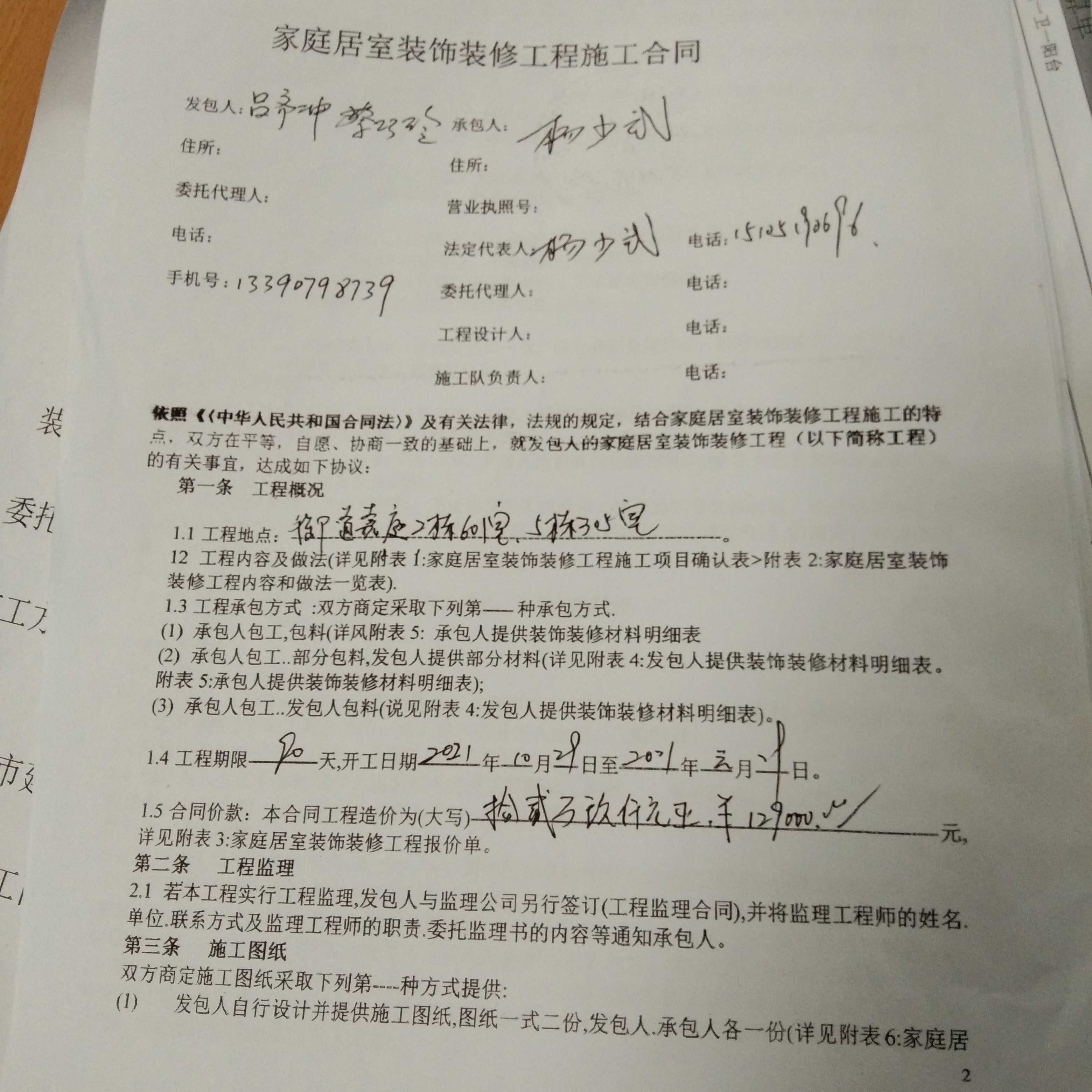 已支付2000元,敲墙的钱多退少补,最终要求解除合同,未经同意的材料运走。
