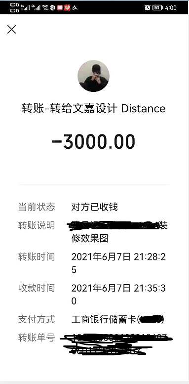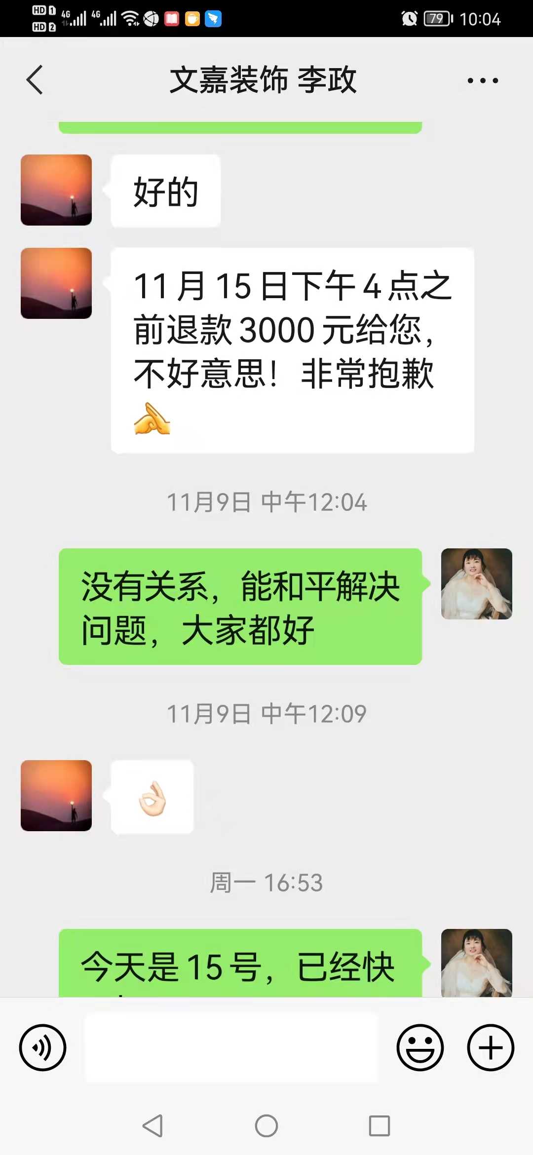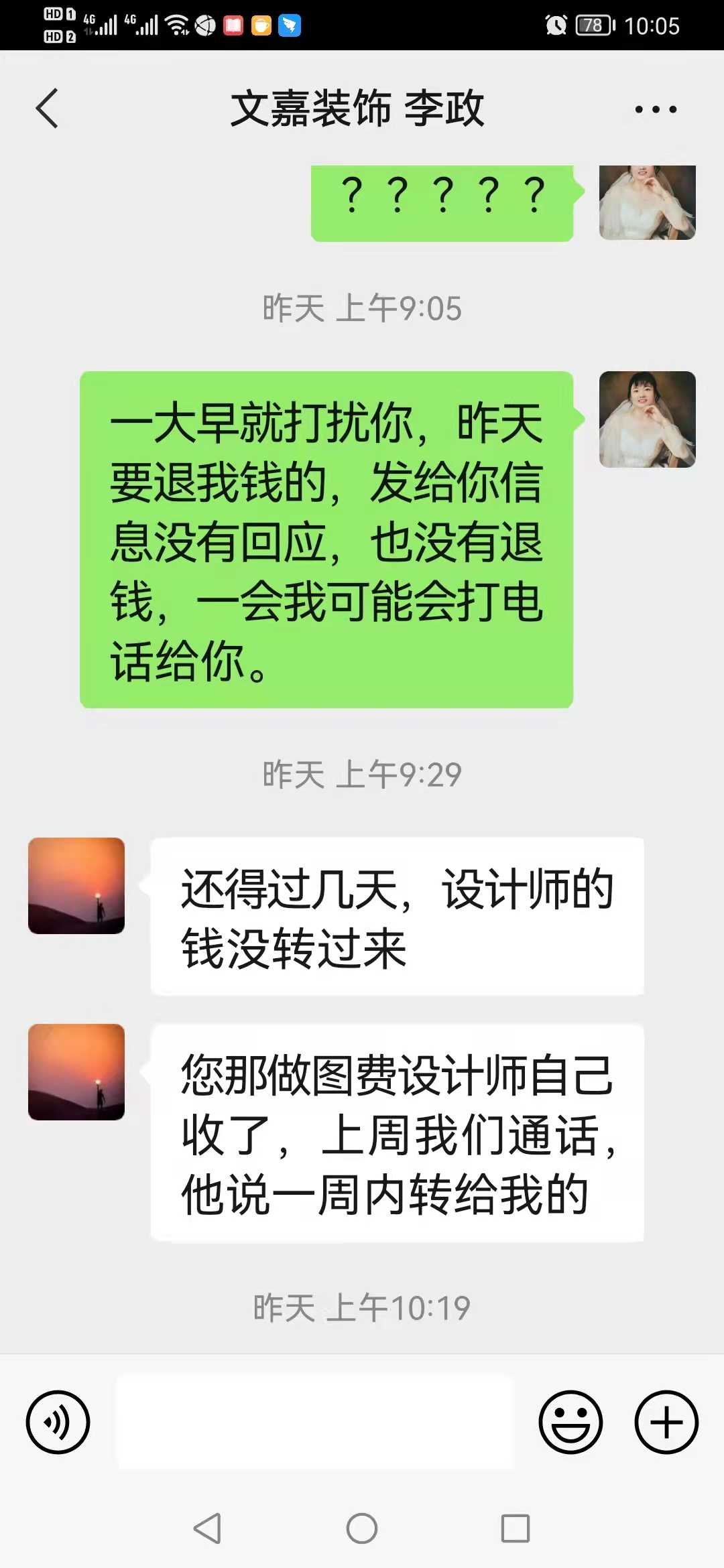今年想装修,所以经常看关于装修抖音短视频,看到好的,也填写了手机号过去咨询,在今年的6月份,由星联新装修管家平台推荐了南京文嘉装饰工程有限公司的设计师到我家去量房,然后再微信里面沟通,我希望能出个效果图,看下我以后家的样子,设计师说是出效果图3000元,我就在微信里面转了3000元给他,他也拍了南京文嘉装饰工程有限公司的现金收据给我,我一直在催这个效果图,但是到今年10月份的时候,这个设计师找各种理由,就是不给效果图,还要我再给13200元出设计图,我没有同意,后来又说和公司商量了,只要我再出6600元就可以了,我还是没有同意,要求他要么给效果图要么退钱,这时,这个设计师就开始说,电脑进水了,图交公司了,公司要我再付13200元才能给图,后来说是和公司谈,只要我交一半,再给6600元,就给图,我没有同意,他就开始说公司注销了,人员解散了,公司不存在了等各种理由。我这个时候才意识到,有可能遇到网诺诈骗。但是手上有南京文嘉装饰工程有限公司的现金收据照片和转账记录,就试着和这个公司的法人联系,联系的结果是可以退款,而且承诺2021年11月5日4点钱退还我的3000元。但是到了15号没有退款,到16号我再联系这家法人的时候,他就说,设计师没有交款到公司;我又找了这个设计师,他说已经交了,和他没有关系,我把双方的对话都发给了对方看,也发给了星联新装修管家平台的那个联系人看,不知道他们谁在说谎。后来再联系这个设计师就不接电话了,联系法人也说钱没有到公司,他不退款。