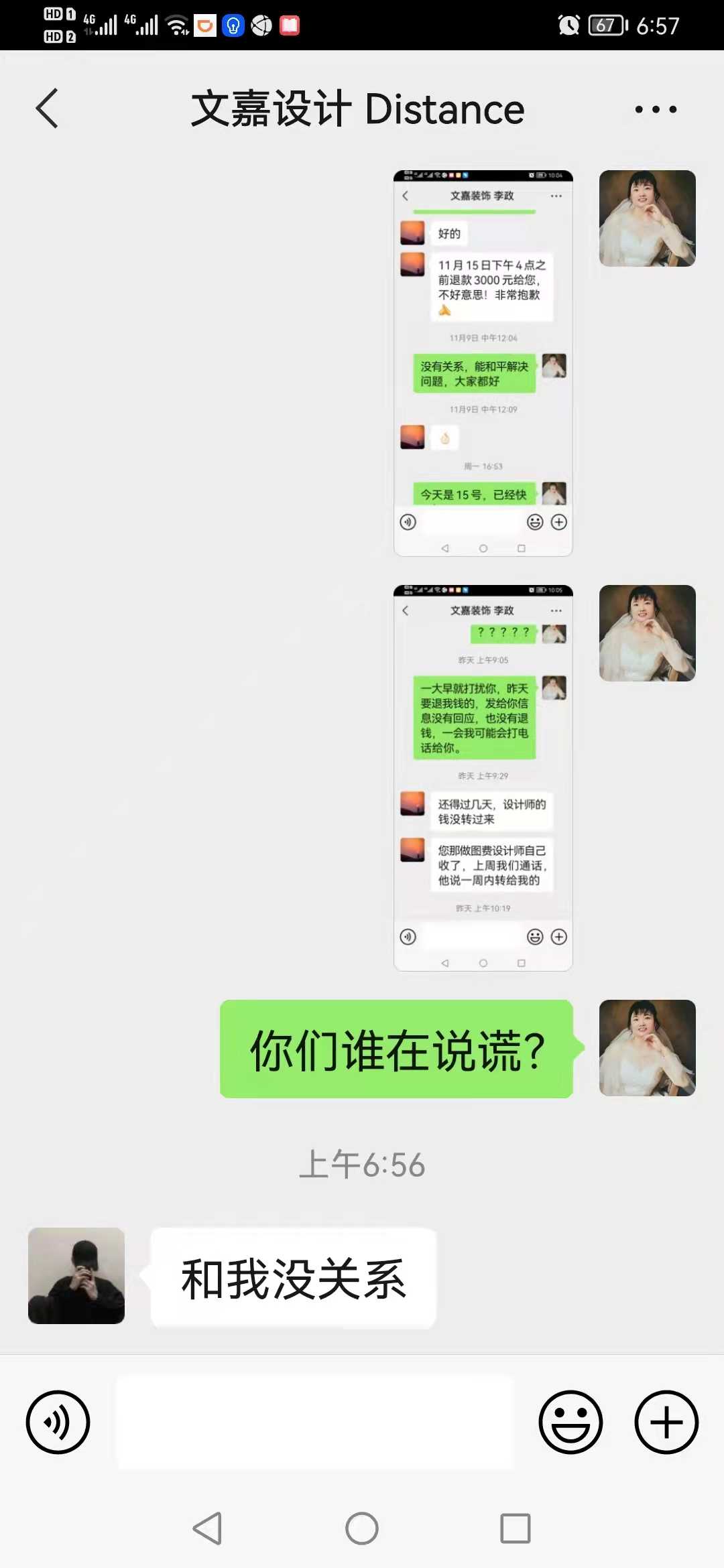 文嘉装饰负责人反馈:消费者把转私自转给设计师,现在设计师离职走了,还说已交到公司,但提供不了任何转帐记录。公司也不可能承担这笔费用,只能报警处理。 维权站询问文嘉装饰目前是否还在正常运营,回答是肯定的,只是公司人员变少。 | 2021-11-25 |