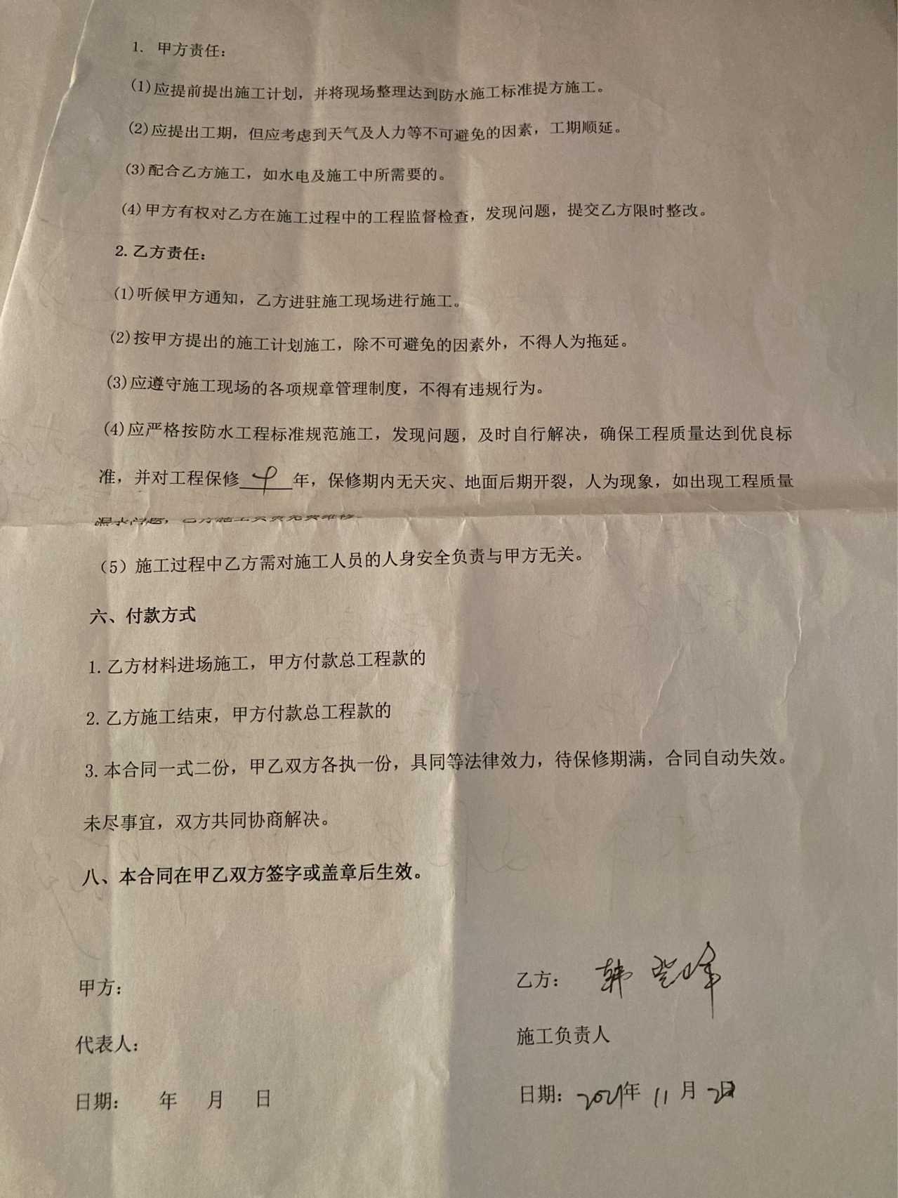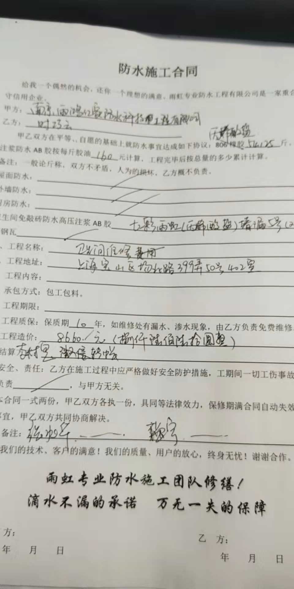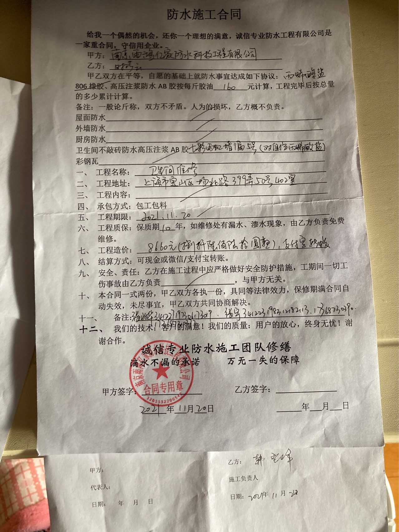 防水公司负责人表示:公司都是明码价格后开始施工,消费者也同意的,发票也有,胶都有合格证。目前消费者到处投诉,也投诉到12315了,防水漏水质保3-5年,有后期有质量问题公司肯定会负责维保。 | 2022-01-07 |