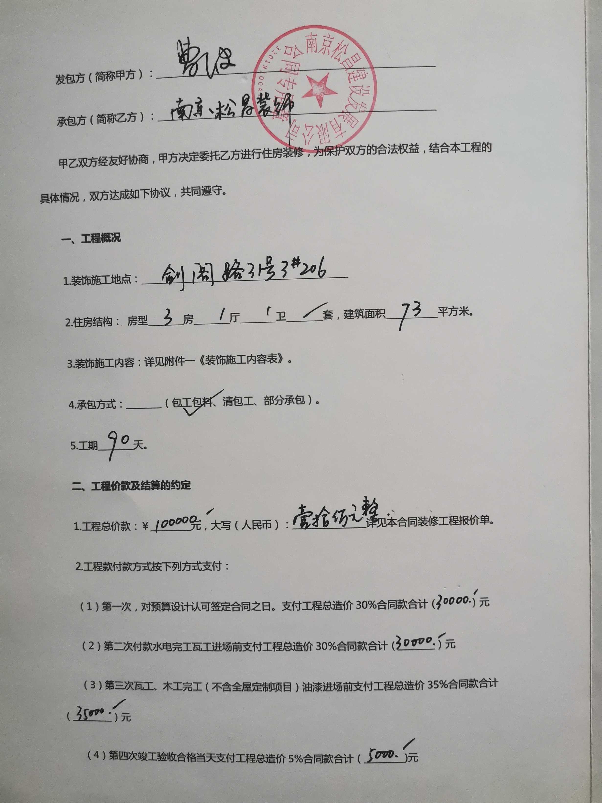 本人看到松昌营字[2020]10号活动,于2020国庆期间去该公司了解情况,公司营销经理接待后,了解到我2021年初开始装修,提出先交1000元意向金后按此双节活动,可后续签订合同。后我于2020年12月与南京松昌建设发展有限公司签订装修合同,工程总价10万元,约定先缴纳1万元定金。2021年春节后根据该公司要求,由该公司人员介绍拆除人员对剑阁路31号3幢206室的原装修进行拆除,4月举行开工仪式,项目经理提出需拆除墙皮重做粉墙,同一公司人要求不一,我只能自行找人二次拆除并粉墙,于2021年5月6日完成,并通知公司水电进场,自5月7日起,已按公司要求将房屋拆除完毕并粉墙及粉屋顶处理完毕,并按合同要求支付工程款各期工程款。根据合同约定,完工时间为三个月90天,但松昌公司在合同履行过程中各环节管理混乱,工期一拖再拖,本人多次催促,松昌公司不按合同履行相关义务,后发展为不接电话,也不派人过问协商善后事宜,直到2022年1月7日为止,仍未竣工验收。已严重影响本人的家居购置及正常生活,