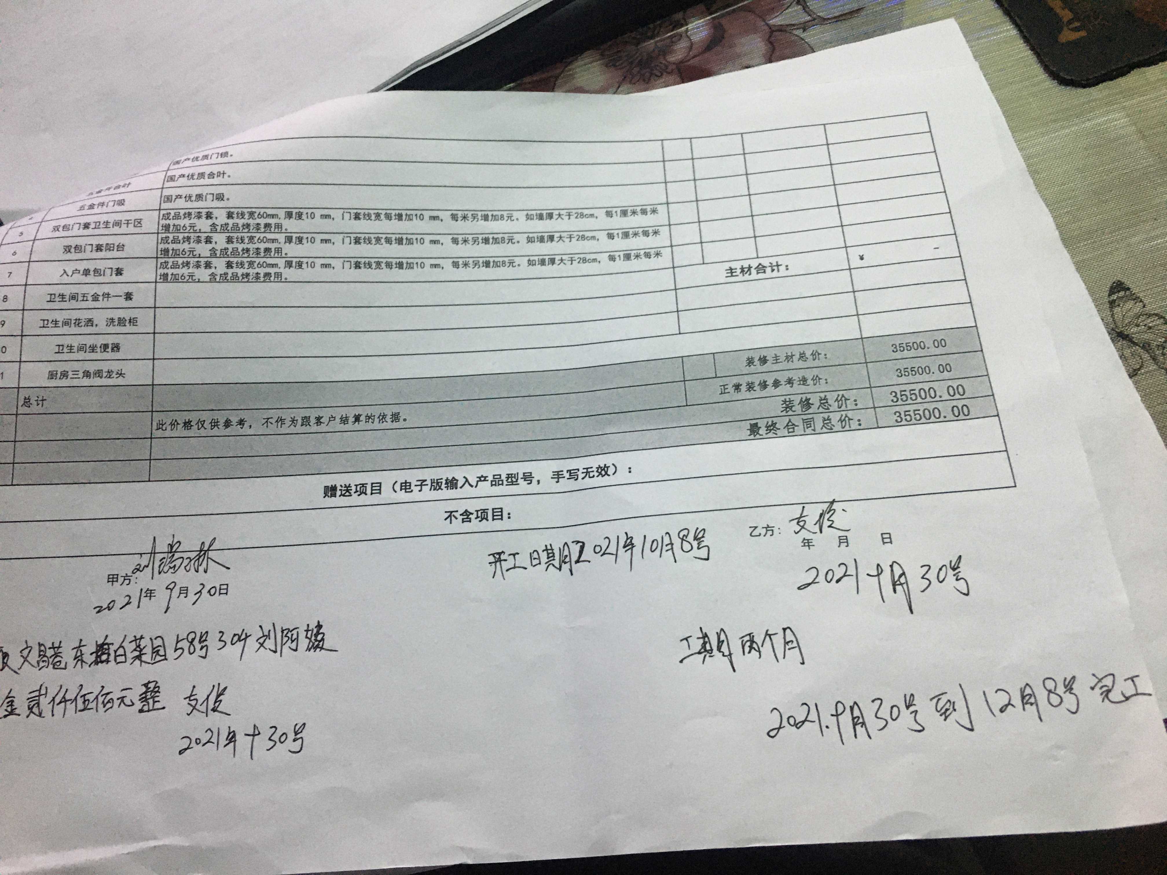 21.9.30?- 12.8日与齐乐美宅装饰公司签订合同,10.8日动工,局部改造,目前拿钱不干活,最后 答应12月25-26日完工的,至今未完工,? 阳台门没装,二个房间门,进门门套没装。合同里面都有明细,合同上没有敲章,是公司项目经理上门签订。给了3.3万,还剩尾款2550元。