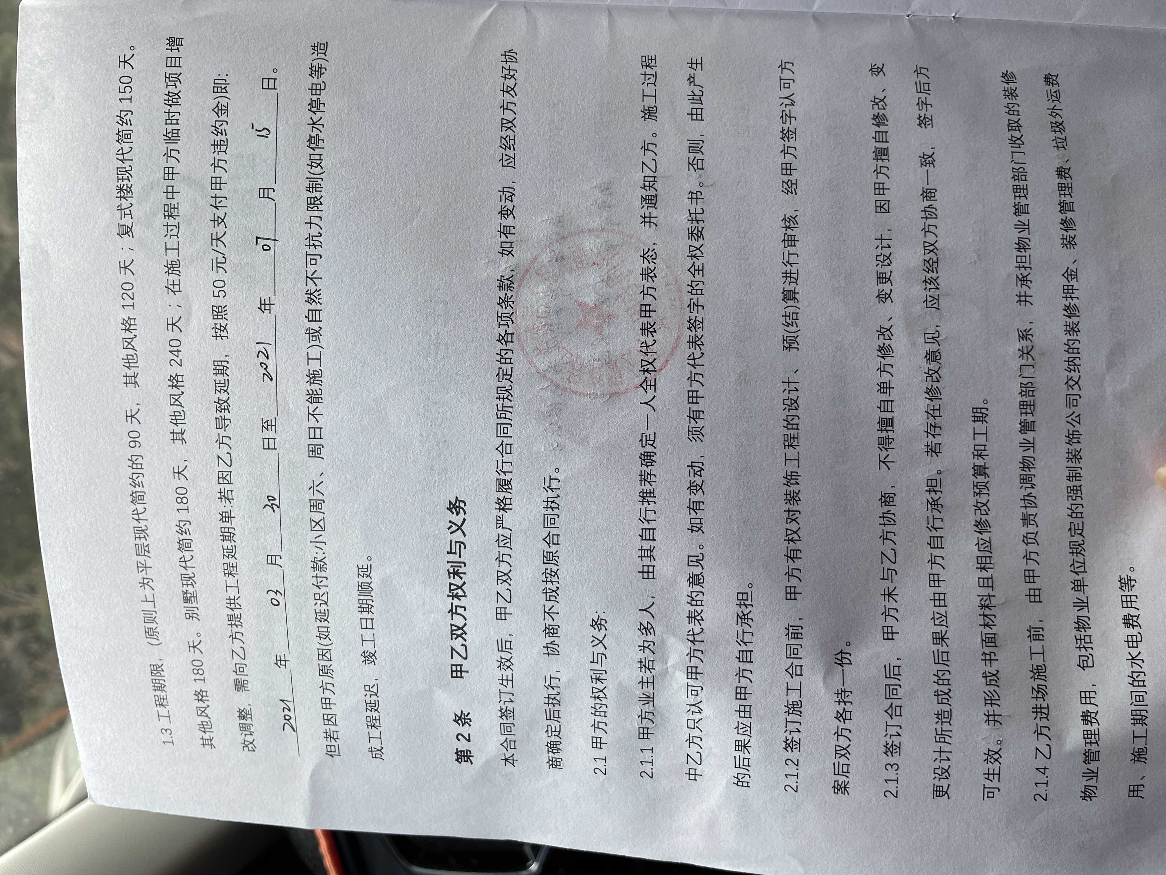 2021.3.31-21.7.15全包,目前工期拖延,一万元尾款未支付,空调没有安装。 到2021年12月23号公司上门验收本人才签字确认