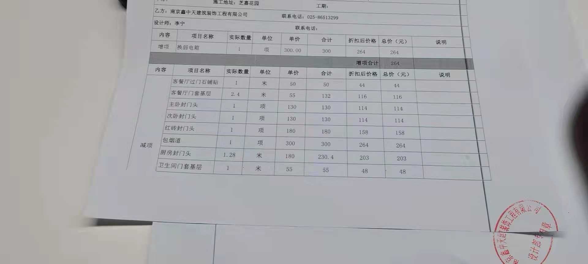 与南京鑫中天建筑装饰工程有限公司 签订6.18-9.20合同,半包,目前已装修结束,但装修过程涉及到减项一直不处理。南京鑫中天装饰不按照减项合同进行退款,1700左右,一拖再拖。