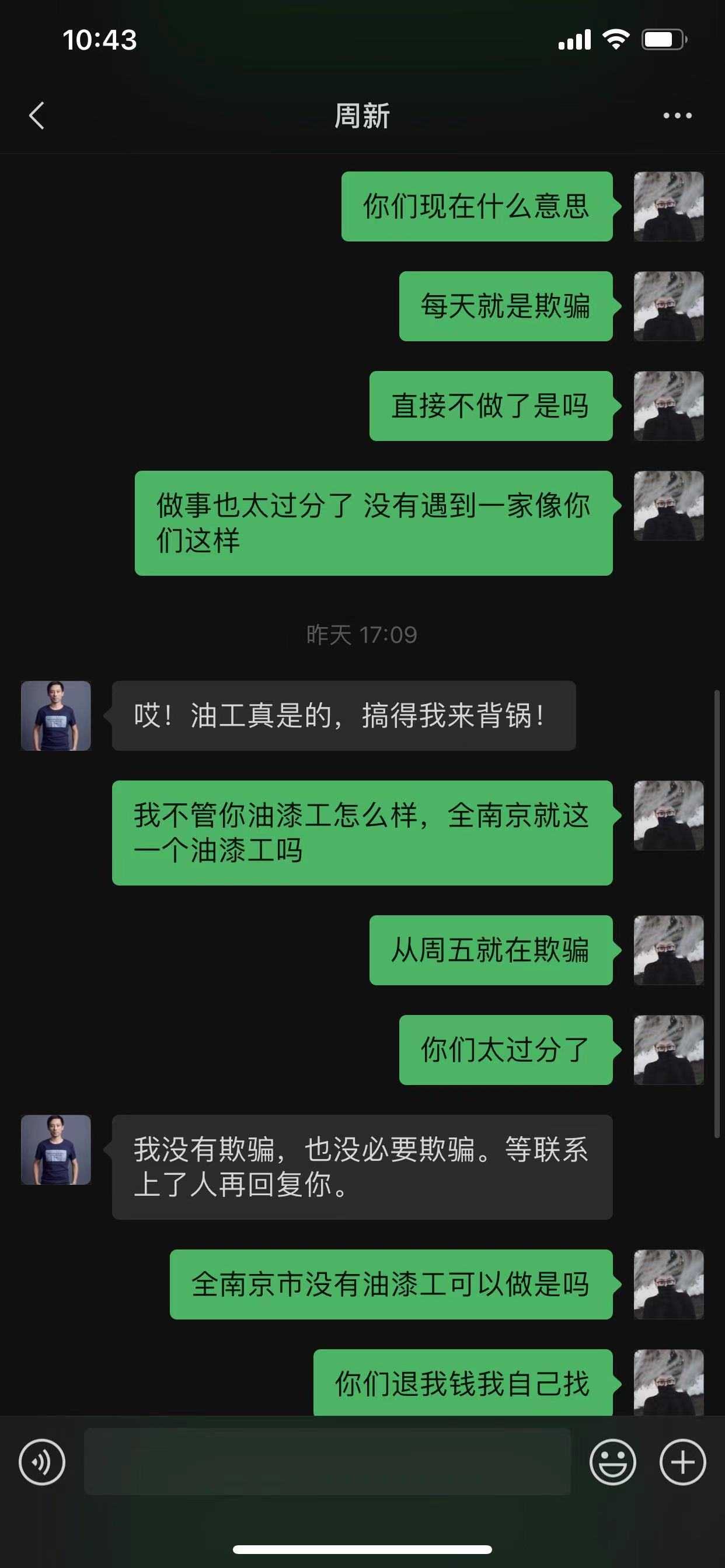 2021年11月18日在南京陶师傅装饰工程有限公司(鼓楼区联创大厦B座3层)签订栖霞区尧顺佳园二期65栋二单元107和108装修合同,直至今日,该公司一直拖工程不干活,钱已经交完毕,就剩最后油漆工程和安装阶段,整个工程整整拖了4个月,每天找他们就是欺诈消费者,拖工程期,老板不接电话,不给出明确时间节点,现在诉求是退还中期款,不能做别做了。