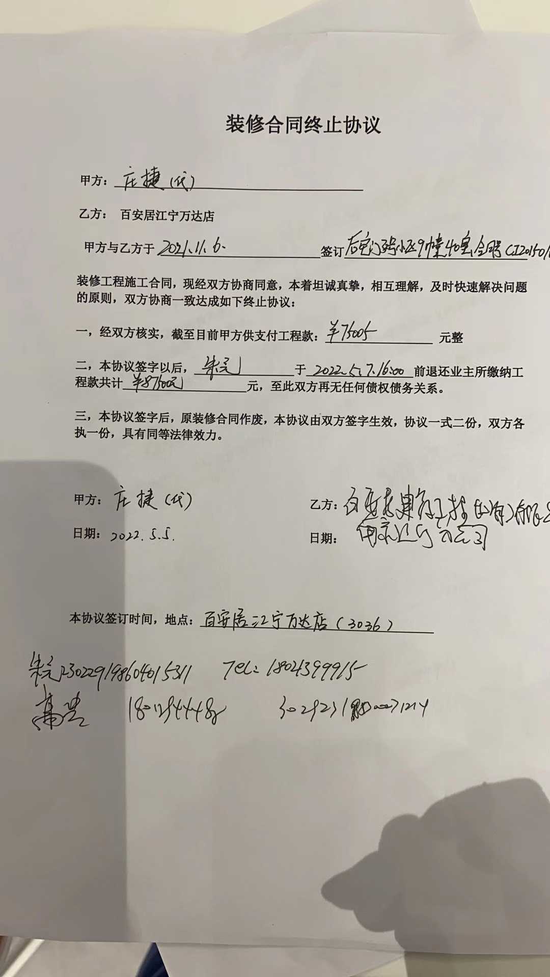 2021年11月6日与百安居江宁店签署施工合同,约定21年11月10日至22年3月10日期间完成对我家的全包装饰施工,在此期间百安居施工进程缓慢,截止到施工结束日期才完成一点点工程,严重拖延施工进度,2022年4月6日更是单方面提出解约,经协商百安居,承诺4月30日退赔费用共计87500元,到期后未果,5月5日本人到百安居江宁店在警察监督下,经百安居江宁店领导协商签订解约协议,并约定5月7日赔款到账,但是到目前为止未收到百安居赔款,拨打客服电话后,百安居无人出面解决,现求助平台帮助解决。