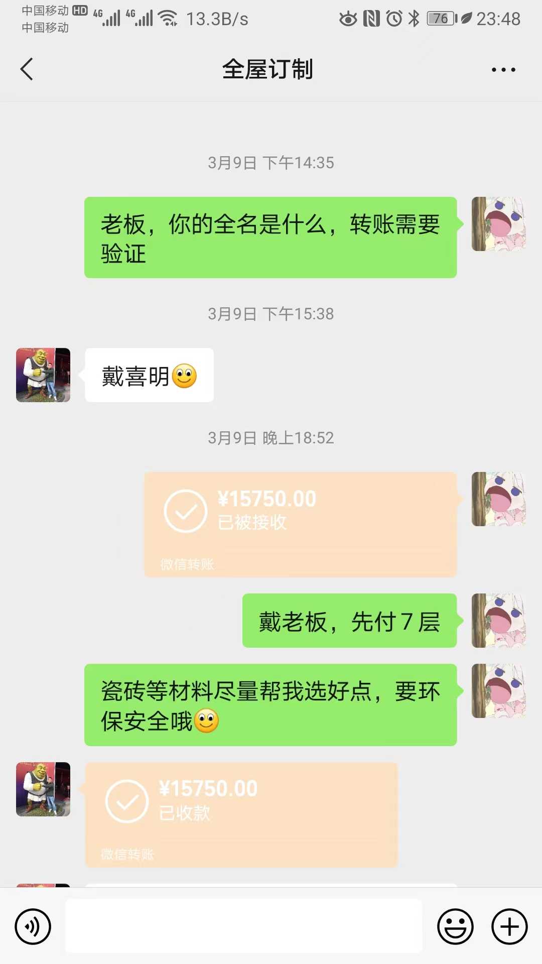 | 投诉类型 | 不讲诚信 | 投诉人 | 周** | 被投诉单位 | 南京市雨花台区鸿飞木业经营部 |