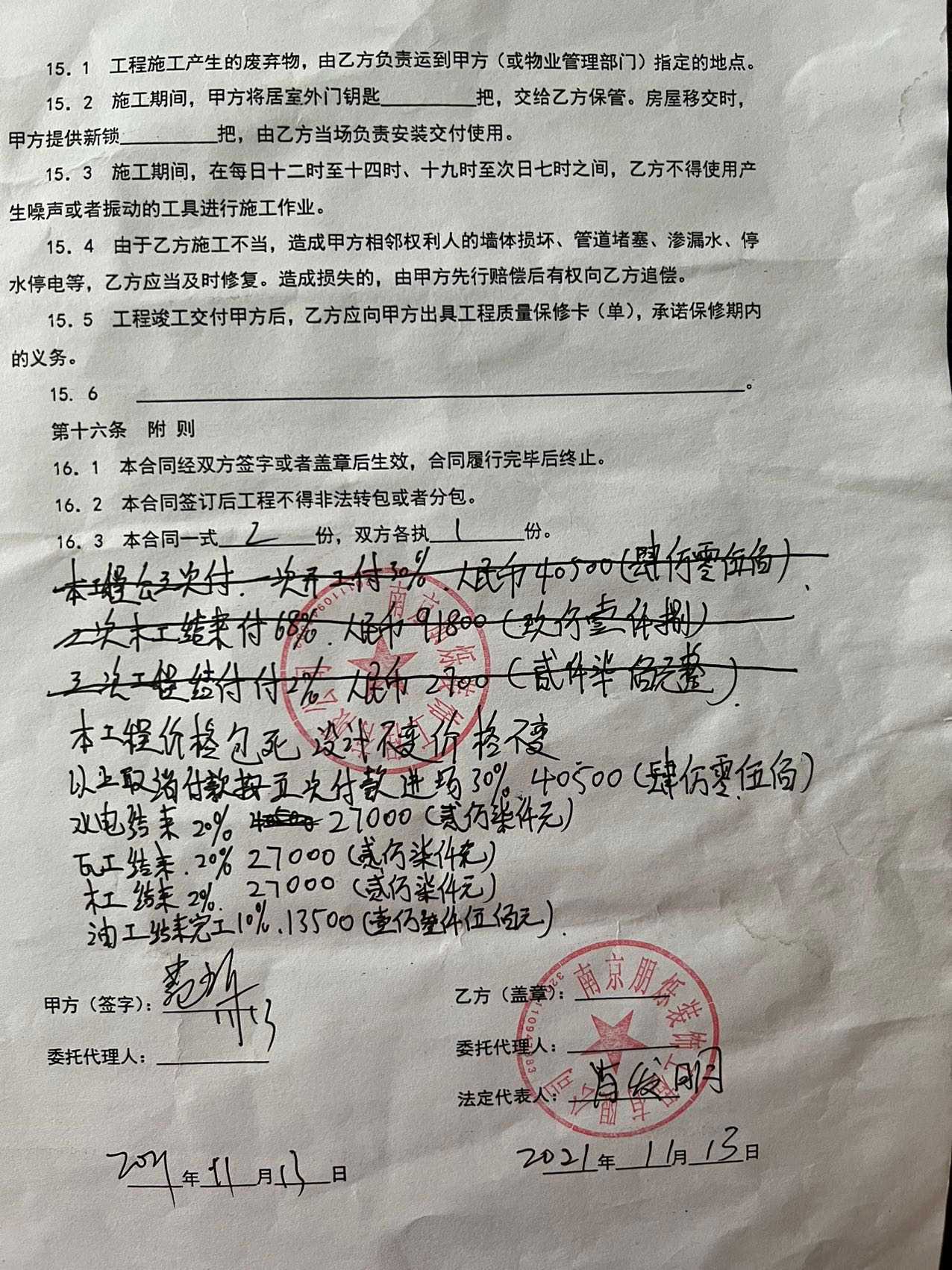 第5张:合同末页,中间画横线部分是乙方哄骗甲方:签订合同时谎报进度款:开工30%、木工结束68%、工程结束2%,为恶意牟利做埋伏,后被揭穿而未果;