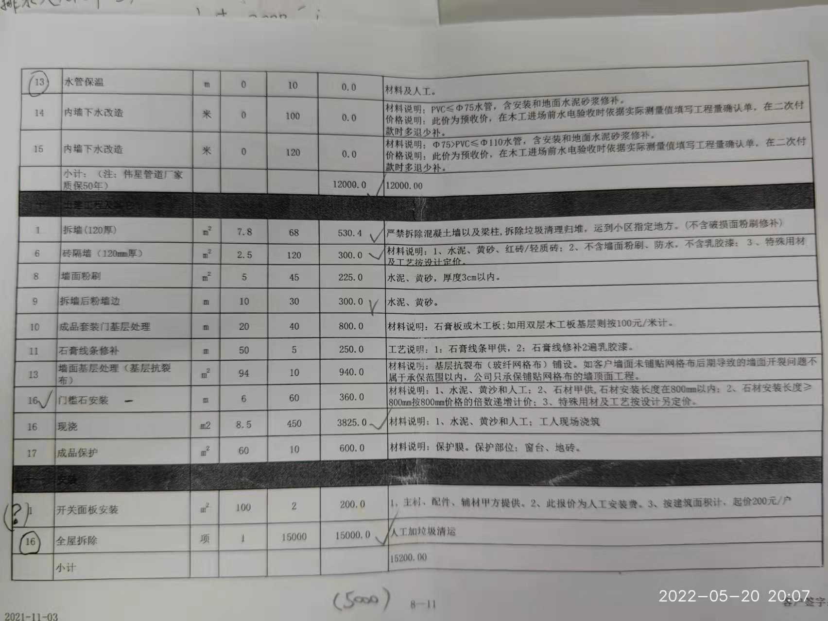 3)全屋拆除和垃圾清运15000元,工程只进行一半,主张支付10000元,应退回5000元;
