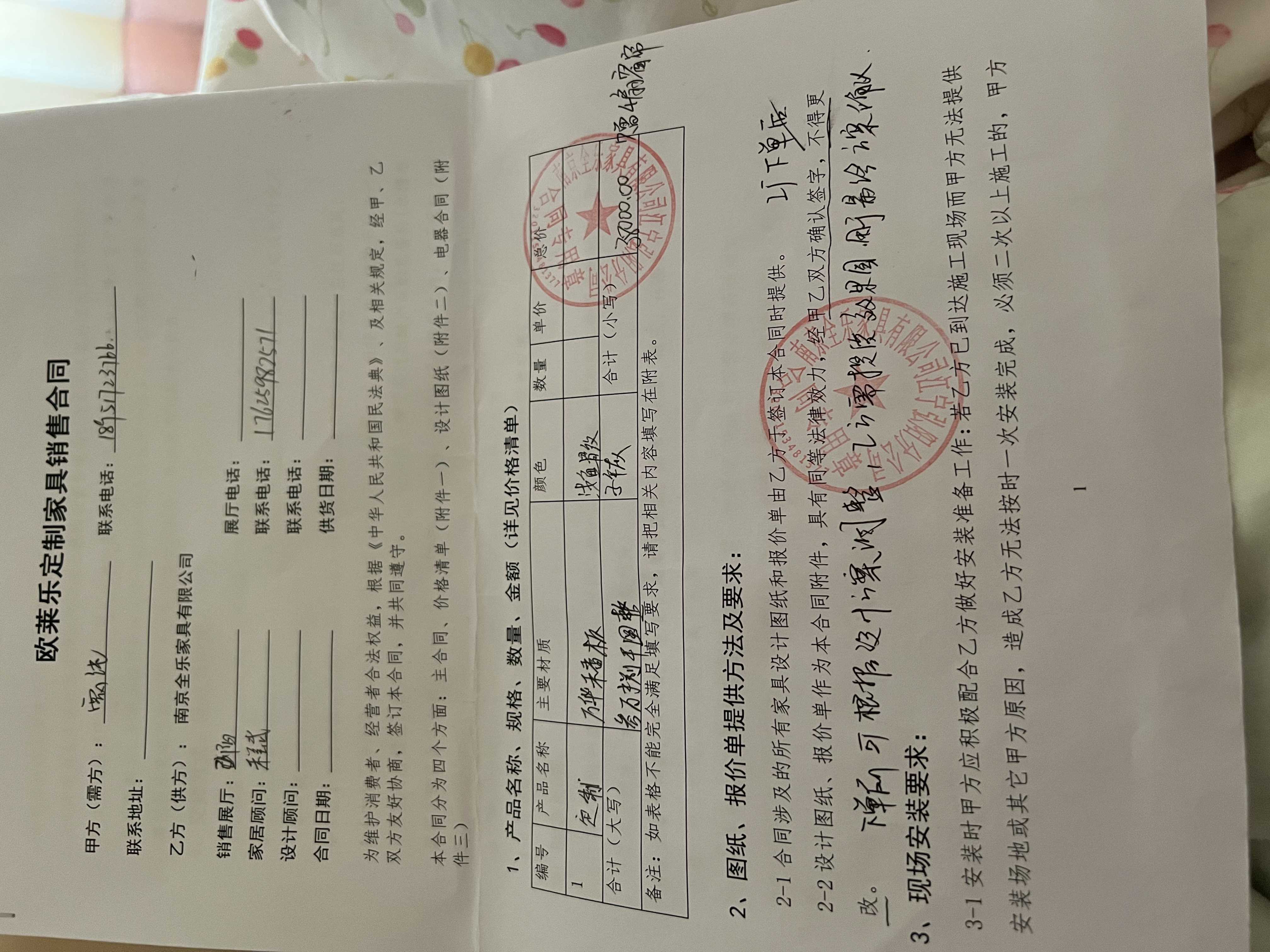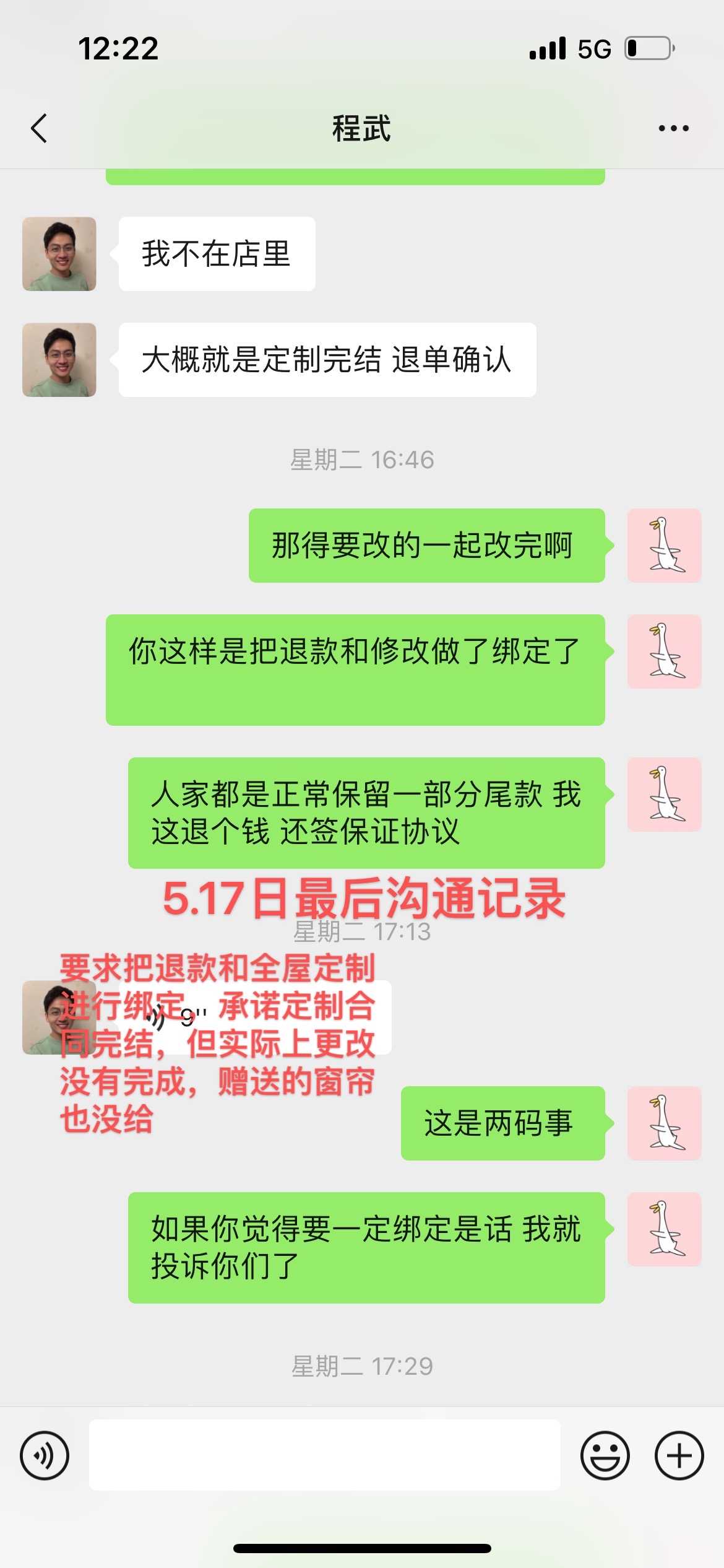 欧莱乐全屋定制负责人表示:1、退款一直是认可,需要消费者到门店处理;2、当时图纸是确认过下单的,按图改施工,如果有需要整改的地方,可以当面沟通,可以来门店与负责人联系,而不是和之前的销售联系(已离职)。负责人表示会与消费者沟通处理这件事。 | 2022-05-27 |