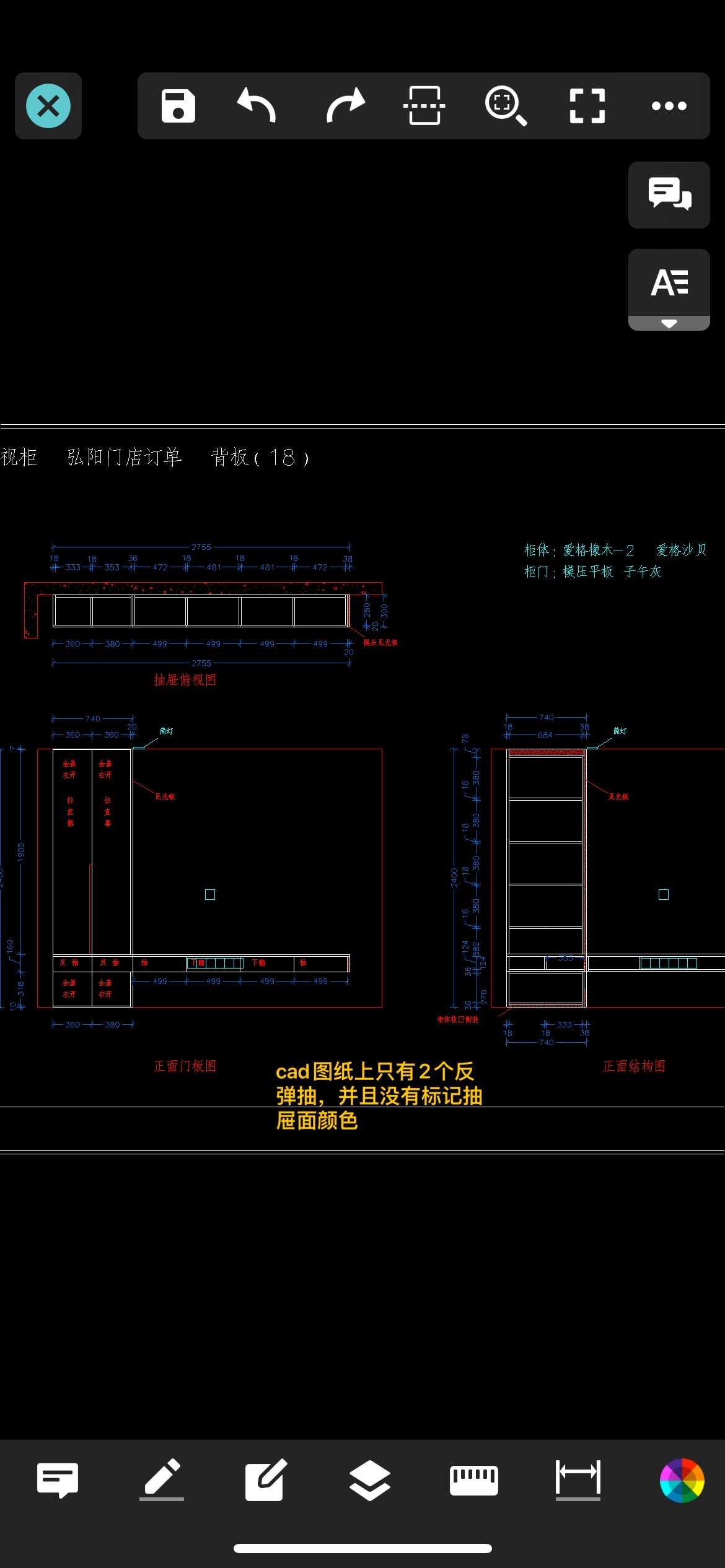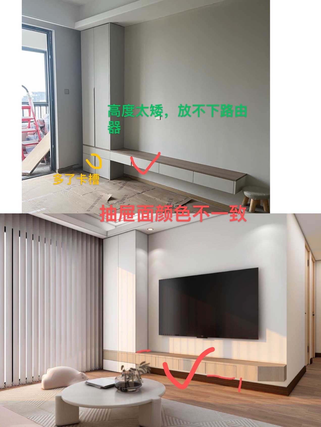 3)客厅悬空抽屉柜面颜色做错,消费者提供的效果图是全木色面,但是实际做成了浅灰色抽面,且实际可用高度只有10cm,不满足提出的放路由器的需求; cad图纸没有单独表明抽面颜色,商家认为默认和柜门颜色一致,但是从消费者角度,店家并没有与我进行信息的沟通确认,也没有告知我与效果图颜色不一致;