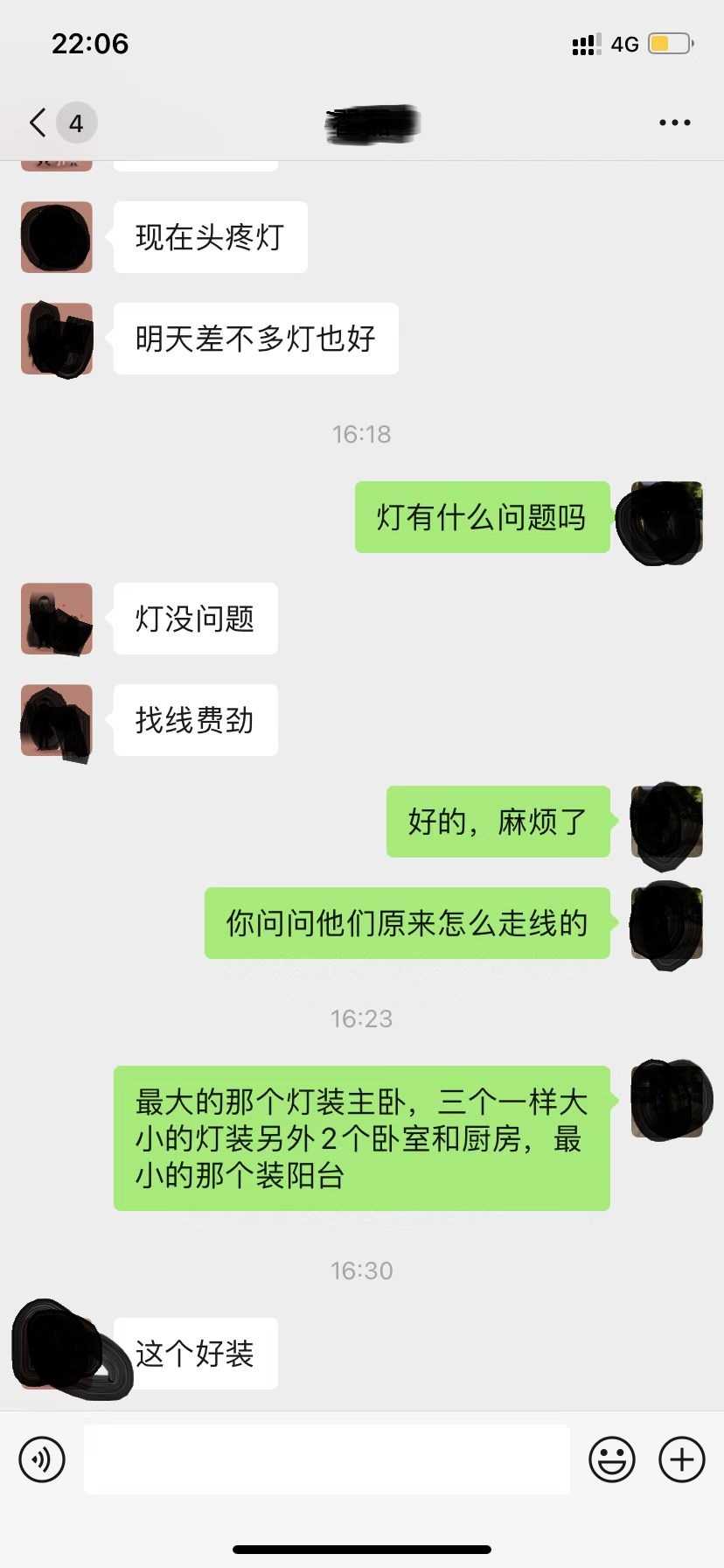 附图2:最新的项目经理聊天记录,目前还在装开关和灯,正在进行收尾工作。
