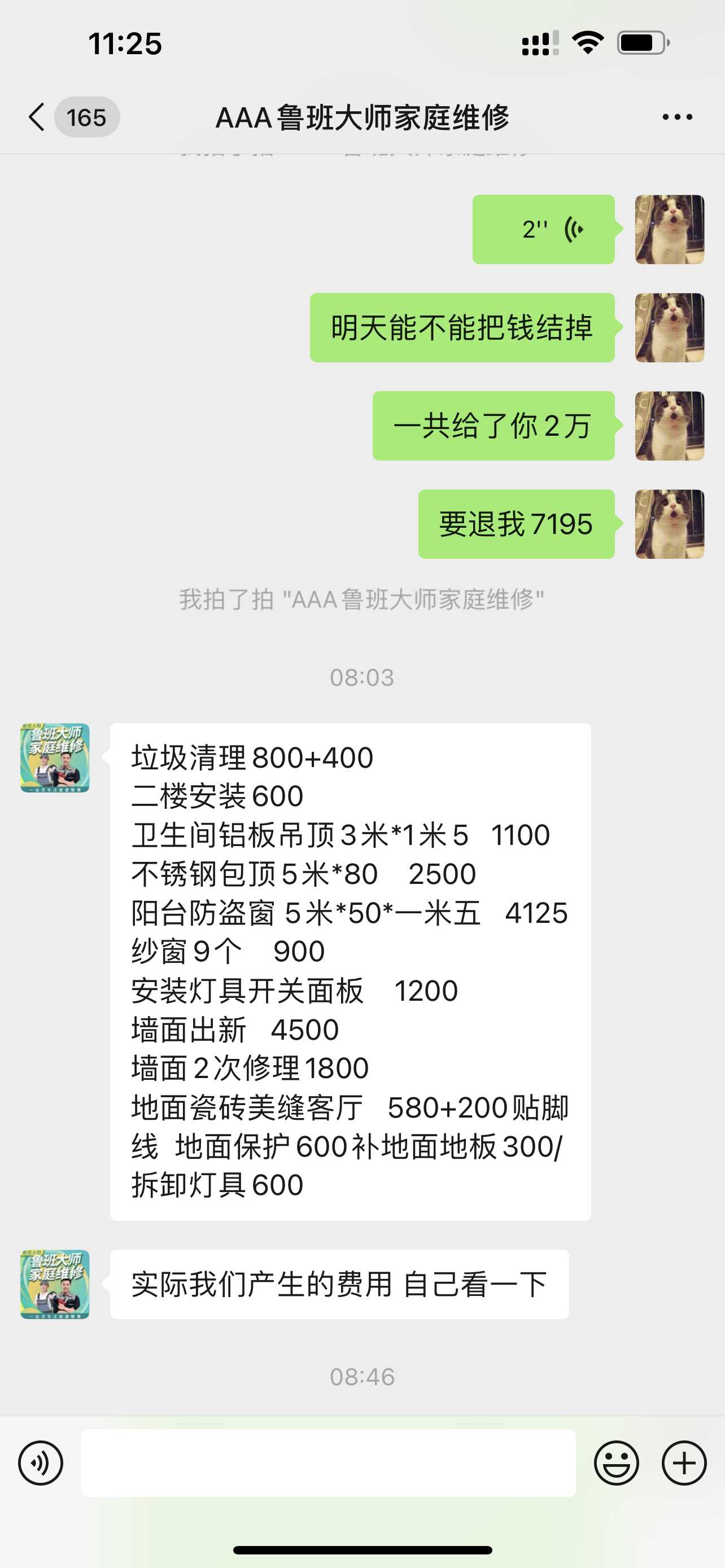 公司不愿意退钱,都有材料报价清单已满足2万,不退钱。双方未签订合同,口头协议,如果消费者不满意,可以走司法途径处理,愿意配合。 | 2022-07-01 |