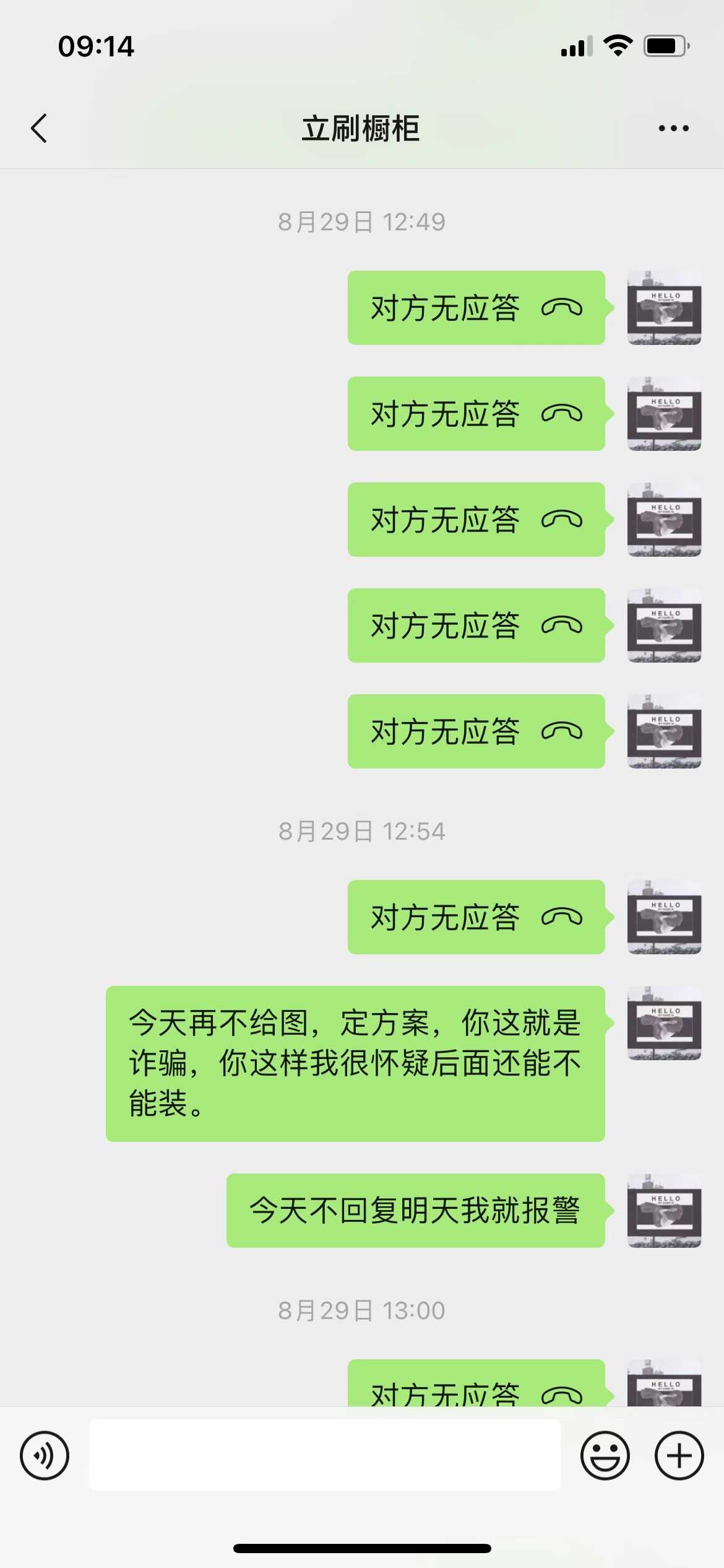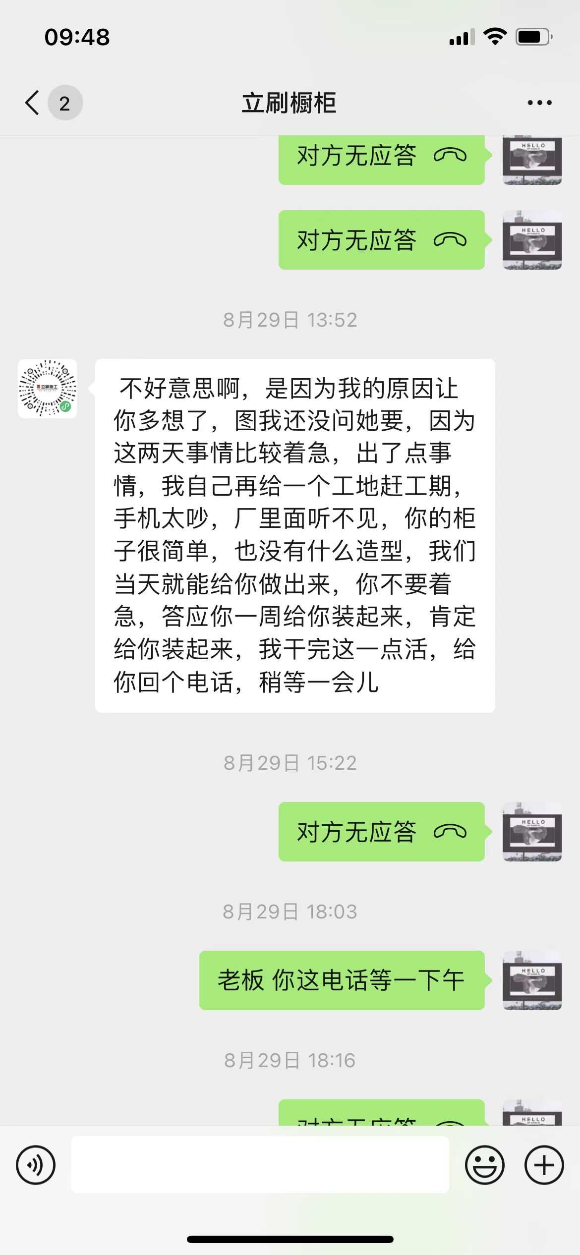 2022.09.07第三次约定2022.09.08上午上门安装,等待一上午,无果。理由是材料在无锡,之前对方说工厂在谷里。