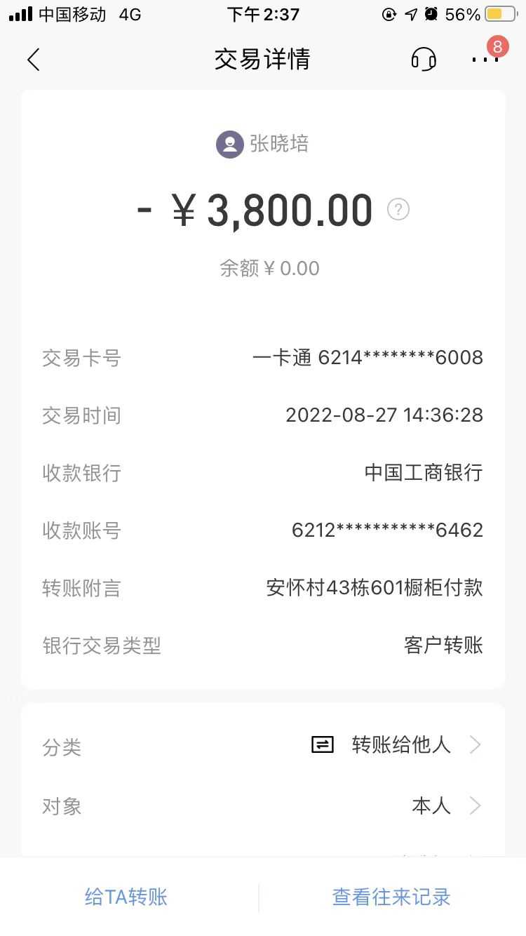 2022.08.27约在越洋国际7楼现场看板材,本人和对方并未对板材颜色达成一致,但对方出具有对方公司公章(南京立刷装饰工程有限公司)的合同单同时要收取合同额的80%(人民币3800元)作为预付款,本人通过银行卡转账完成。<o:p></o:p>