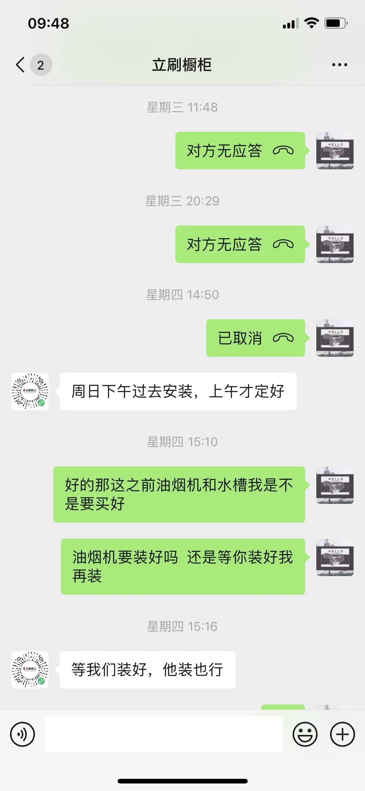 2022.09.04第一次约定上门安装,等候一天,无果,主动联系对方多次被挂断,后文字说明理由是工人问题。<o:p></o:p>