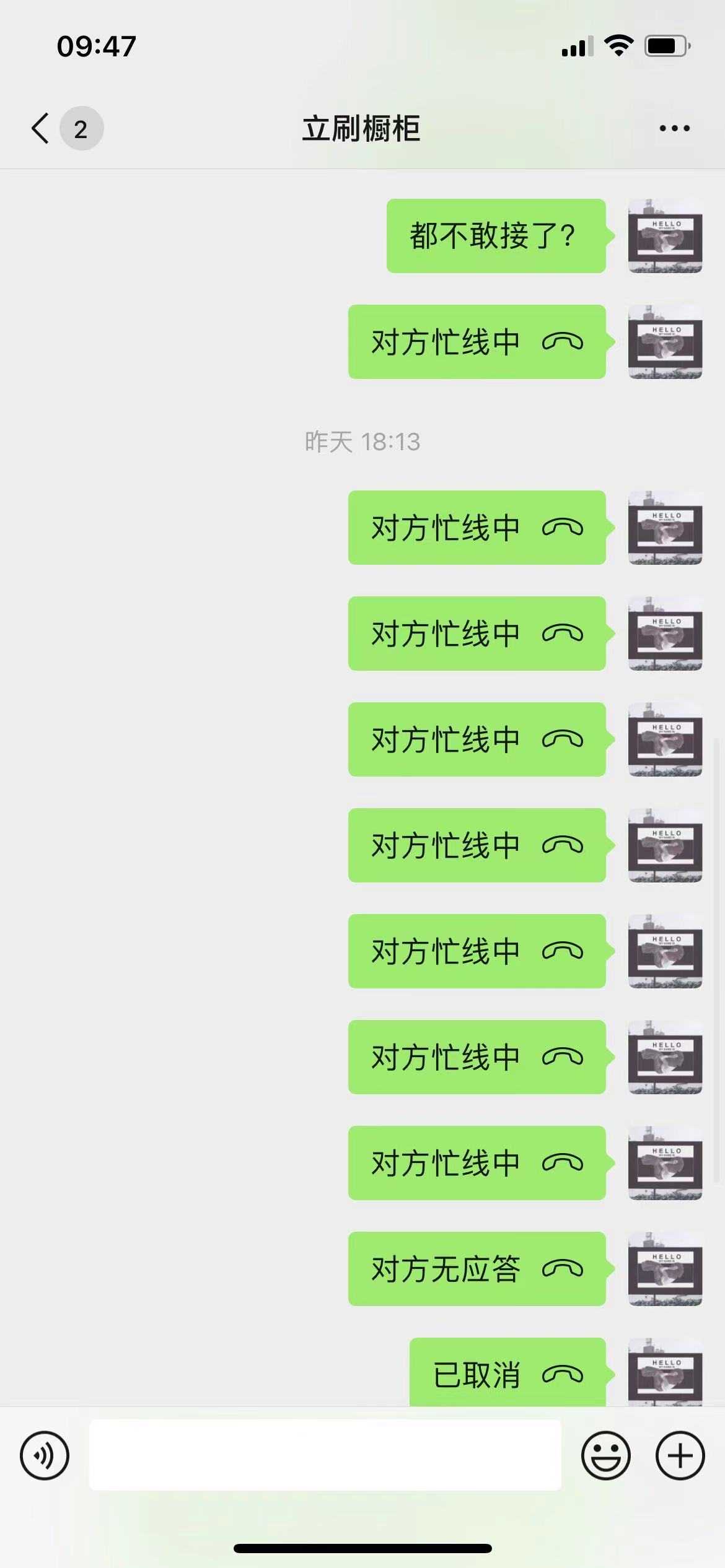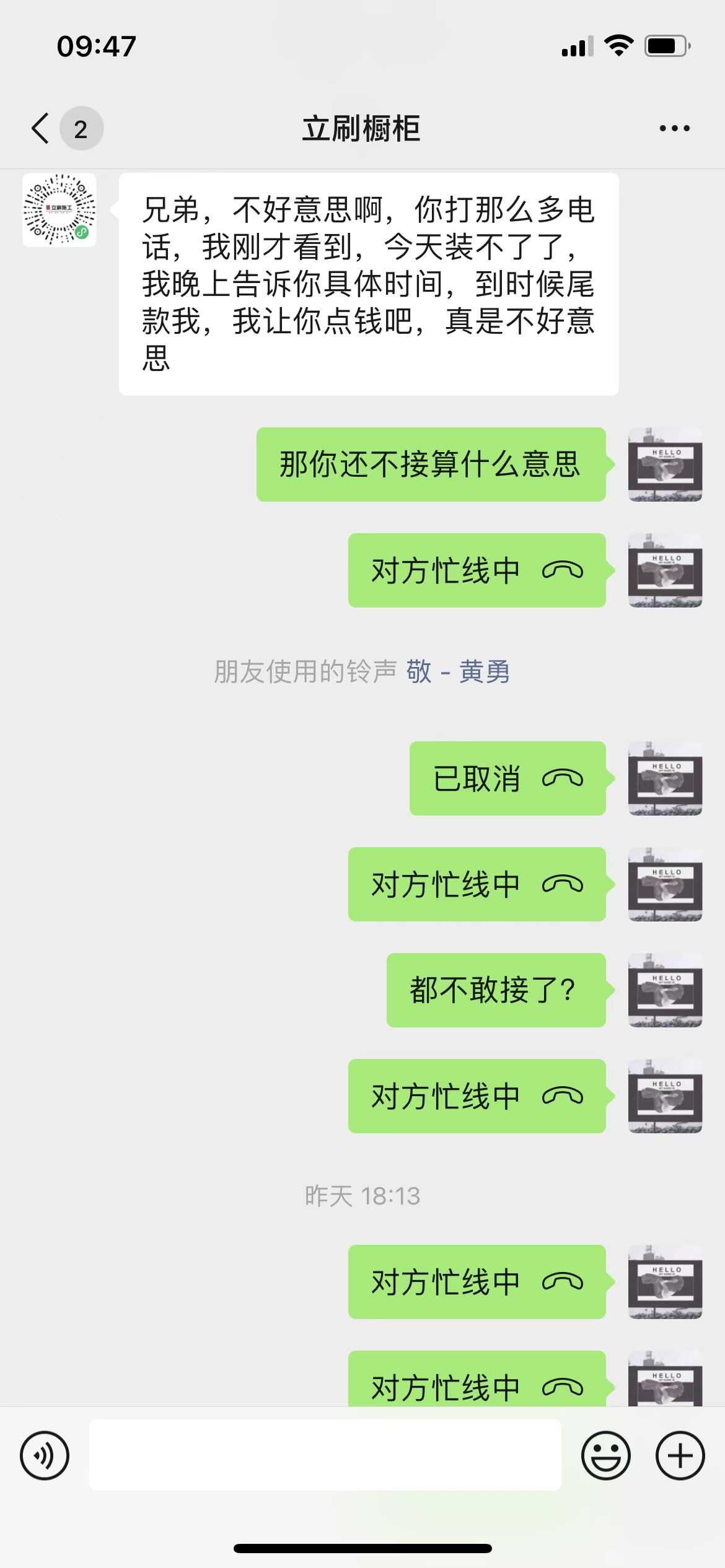自交付预付款之后,和对方沟通困难,多次主动联系对方(手机和微信电话)被挂断,只能被动接受信息,对方从不及时回复,无法完成安装,导致后期装修无法推进无法入住。<o:p></o:p>