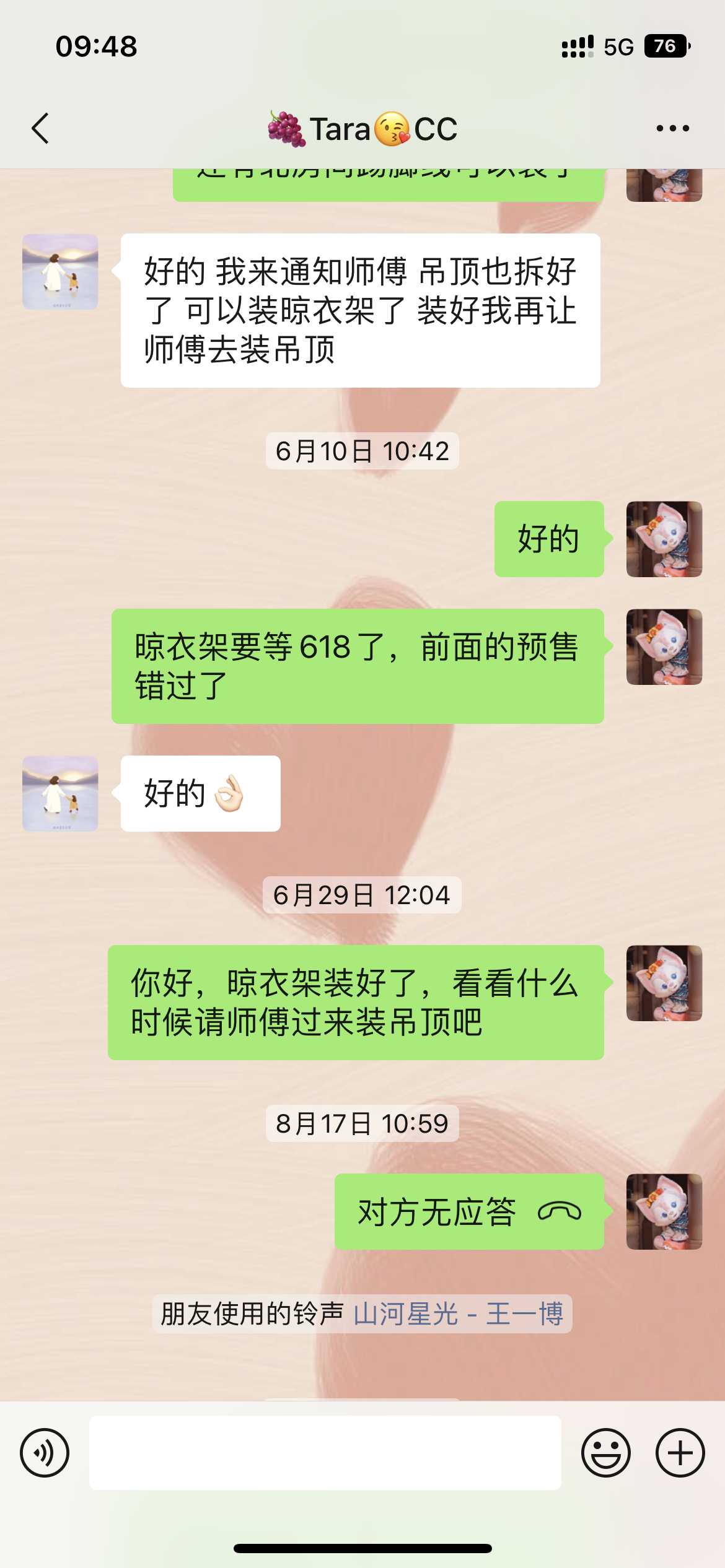 装修公司反馈:工程年初已结束,因消费者个人购买的量衣架尺寸问题,工人去了帮忙拆除,也沟通过150元上门费,消费者都不愿意承担费用。不是装修公司的问题,需要承担上门费进行维修,工人已过去三次。 | 2022-09-30 |