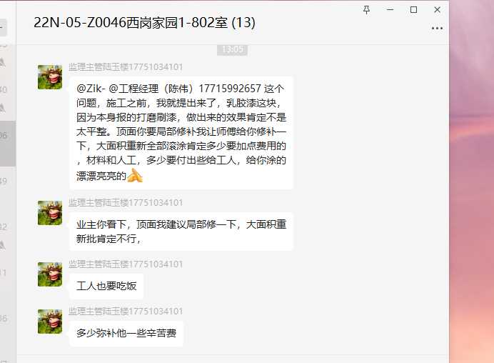 2、今天修补墙面的师傅说,第一天进施工现场,工长说墙随便弄弄,该补补该修修,工人所说的话我有录音为证。所有的顶部问题,工人说没有办法修补,最后联系装修公司,装修公司讲加钱就帮你弄得整整齐齐,不加钱就是随便弄弄。