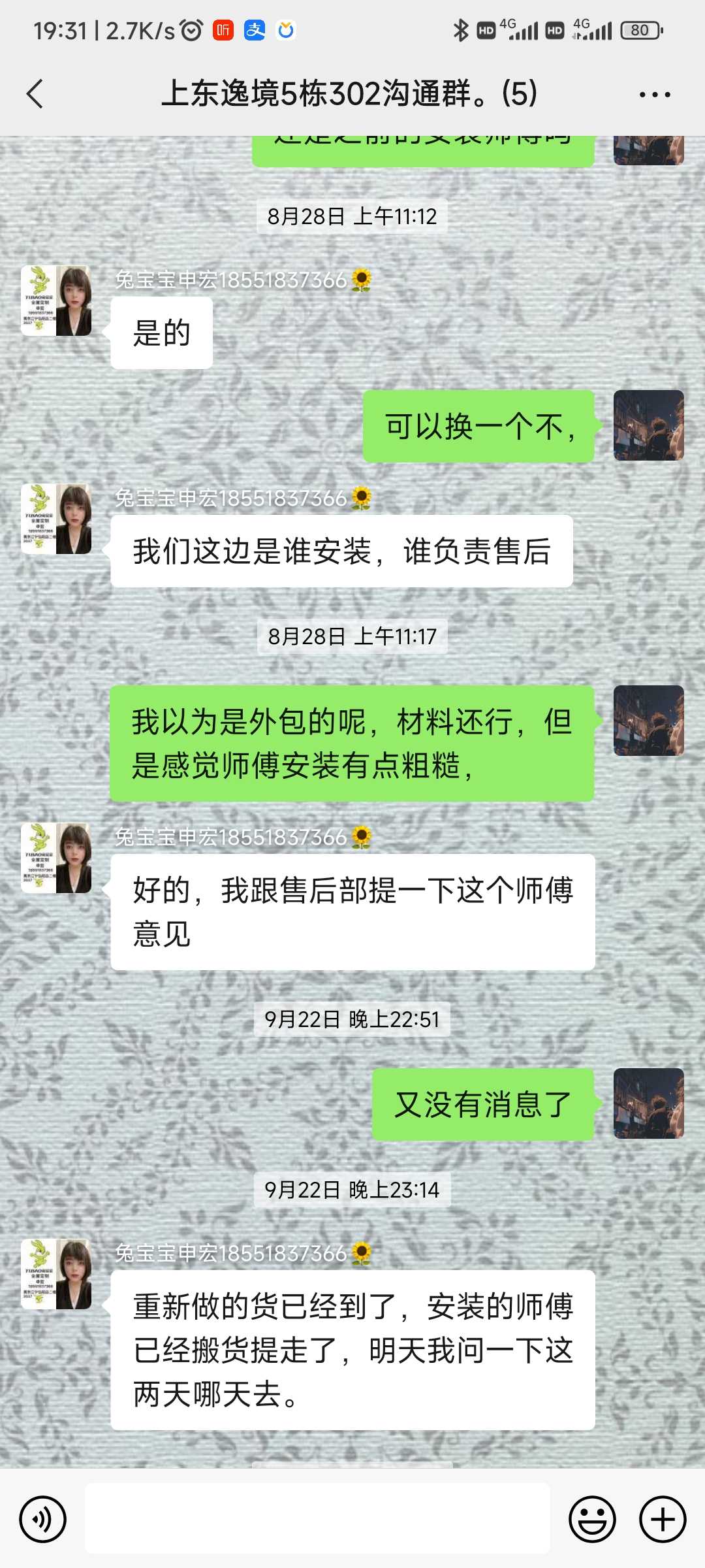 | 投诉类型 | 施工质量 | 投诉人 | 杨** | 被投诉单位 | 兔宝宝全屋定制(南京江宁店) |