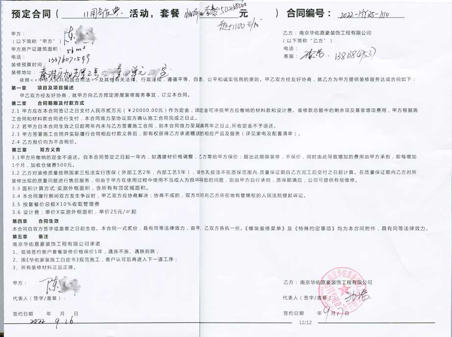 对 南京华佑嘉豪装饰工程 的投诉内容: