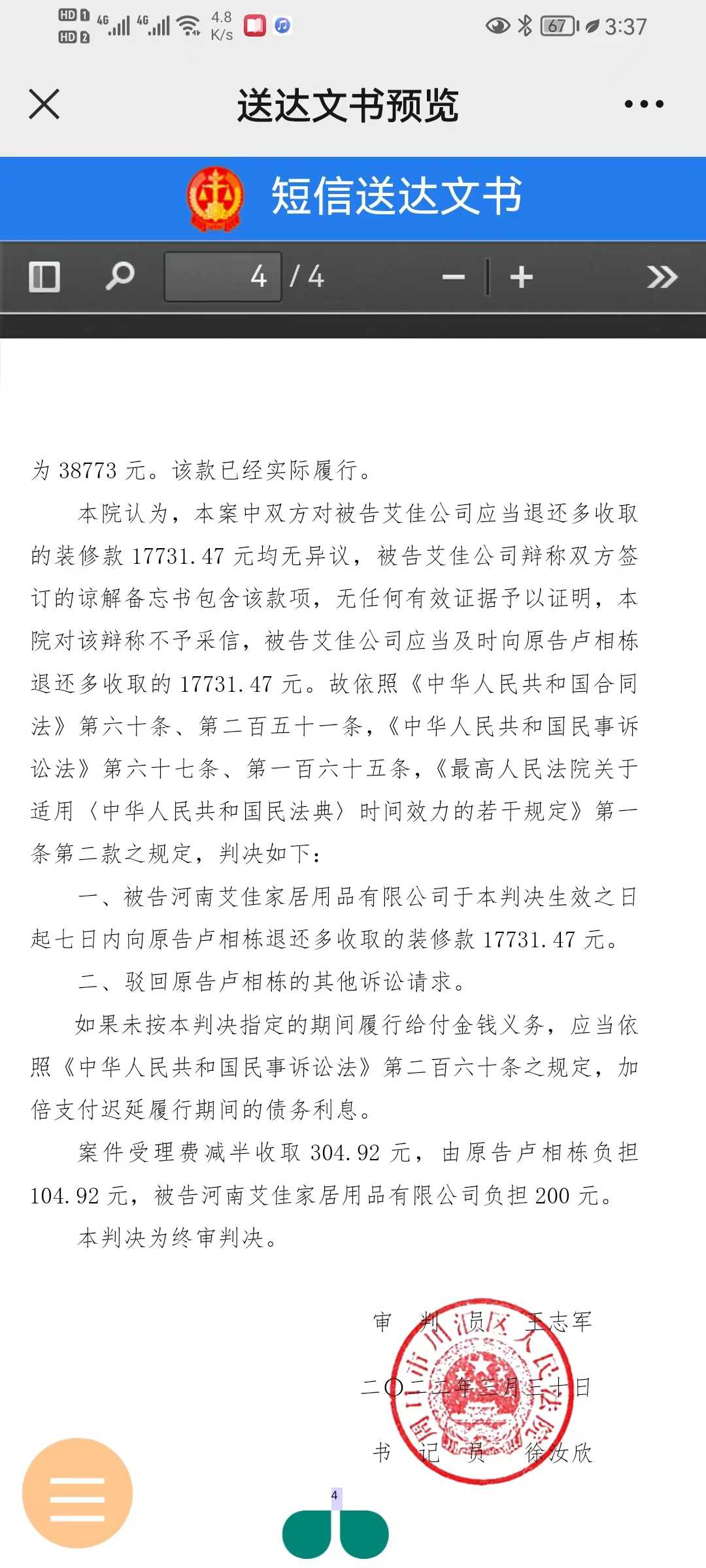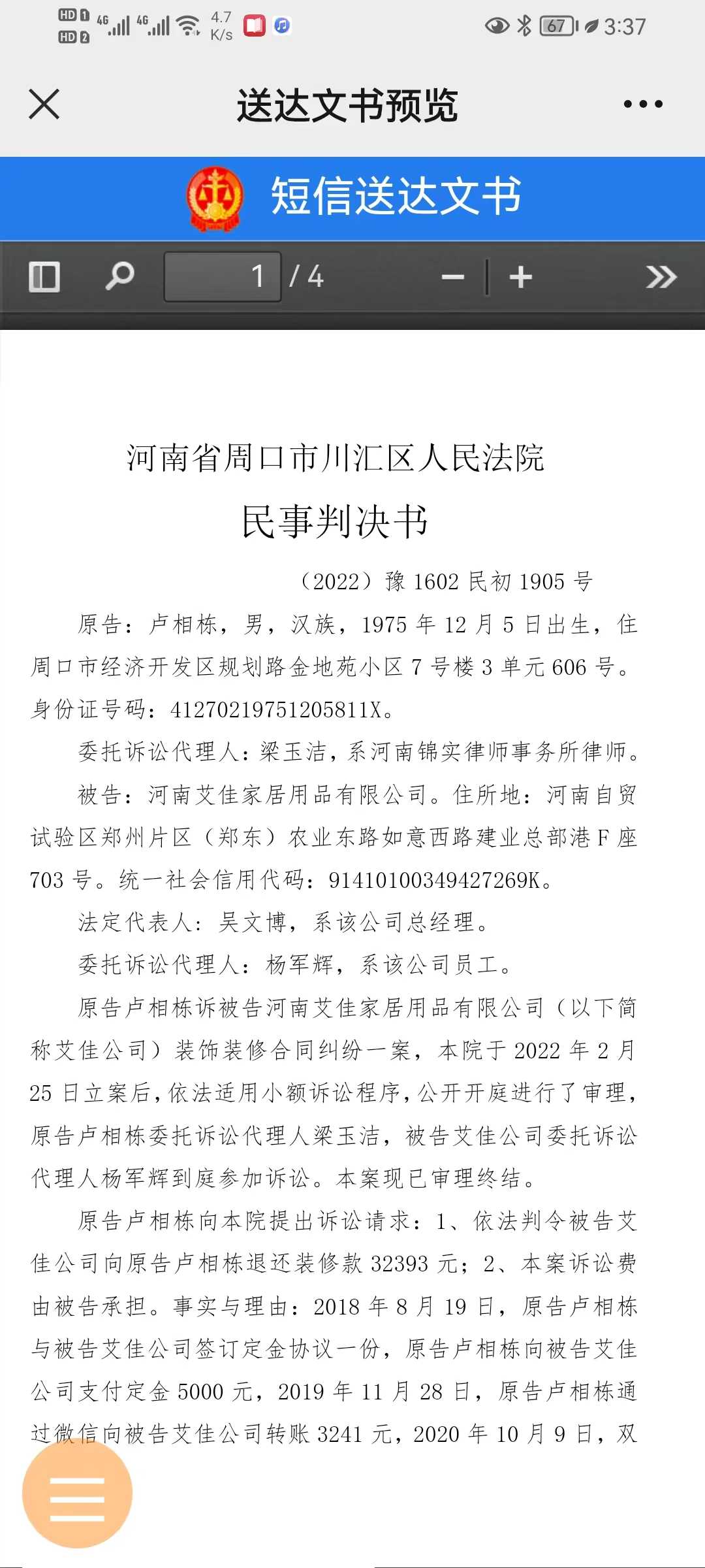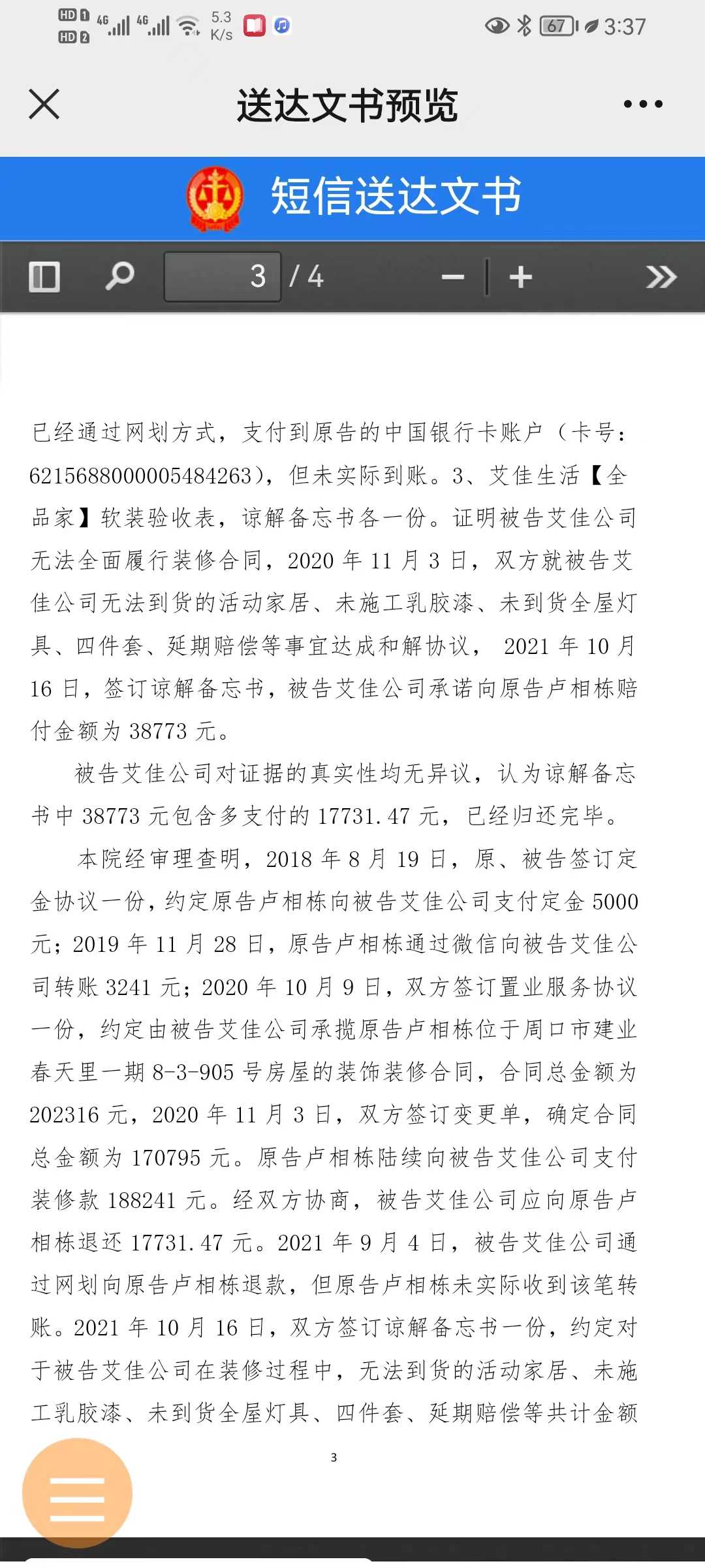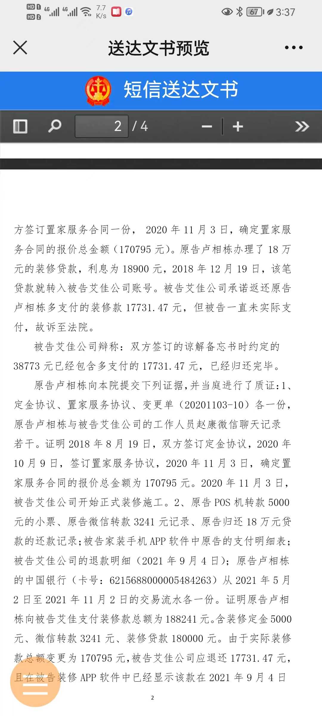 我叫卢相栋,是河南周口建业春天里的业主,在买房开盘初,建业联合艾佳生活(总部艾佳生活在南京),让购房业主交5000元装修意向金,承诺的是该款项既是装修款也可抵充5000元房款,交房前如不想艾佳装修,交房前3个月随时给退款。后我使用艾佳装修,贷款18万元,2018 年 8 月 19 日,与艾佳公司签订定金协议一份,向艾佳公司支付定金 5000 元,2019 年 11 月 28 日,我通过微信向艾佳公司转账 3241 元,共支付 188241元。实际装修中,2021年4月就停工了,后来说是由于艾佳装修公司的原因终止装修,愿意退钱。为了早日了结此事,我们也认了。但是艾佳公司应退还 的17731.47 元,且在艾佳装修 APP 软件中已经显示该款在 2021 年 9 月 4 日