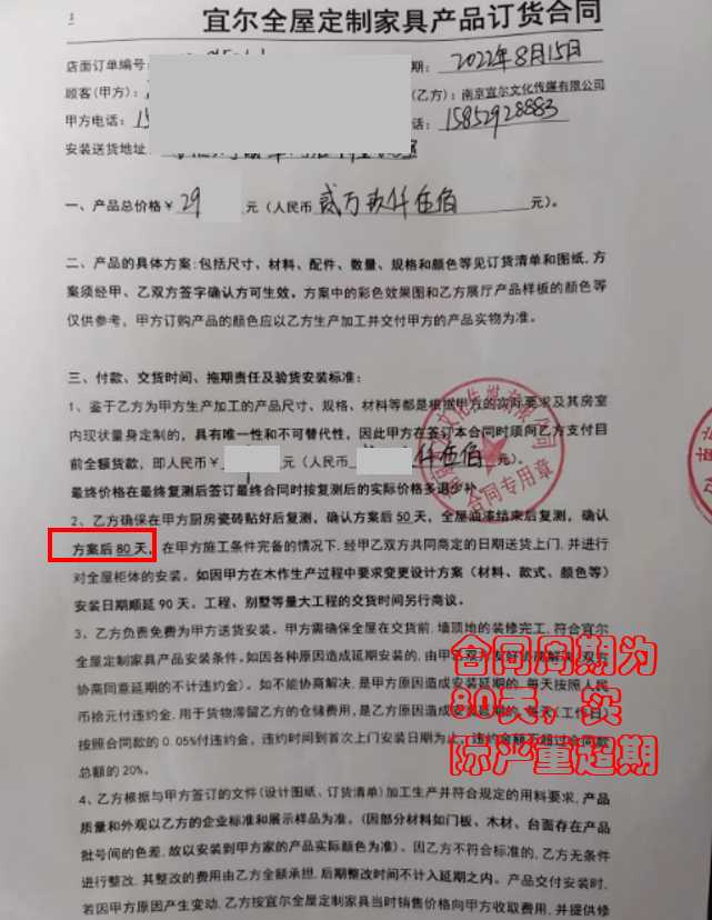 本人于2022年8月15日跟宜尔全屋定制签订合同,合同时间为80天(不是工作日),按照合同规定,该商家应该于2022年11月10日为我安装柜子。11月10日前,本人曾多次确认能否安装,客服均回复可以。但到了11月10日,并未安装,且店长承诺11月20日能安装,但11月20日并未安装,一直到11月25日才完成安装。