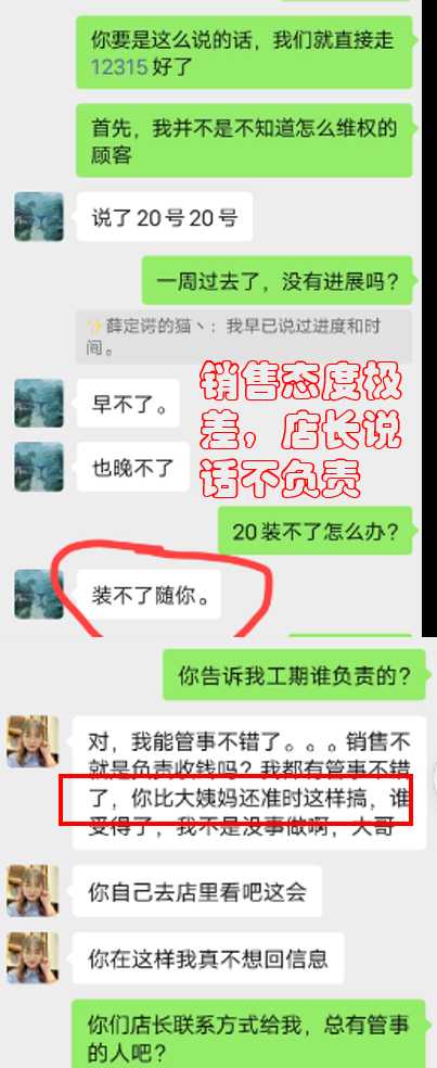 (1)服务差:负责人与设计师总是失联、销售在业主付款前后态度差距巨大,甚至出现了侮辱业主的行为。