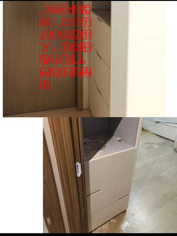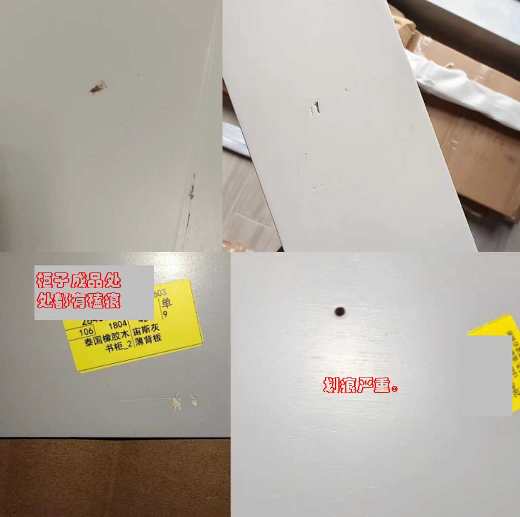 (2)柜子成品质量差(柜子磕痕、划痕处处都有、漆面不达标、气味难以散去)。所有的滑轨质量极差,抽屉滑轨过长导致抽屉难以拉出,且容易移位,商家拒绝整改。