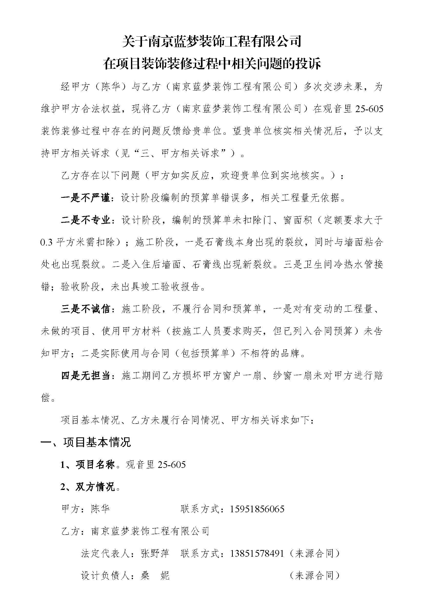 | 投诉类型 | 不讲诚信 | 投诉人 | 陈** | 被投诉单位 | 南京蓝梦装饰工程有限公司 |