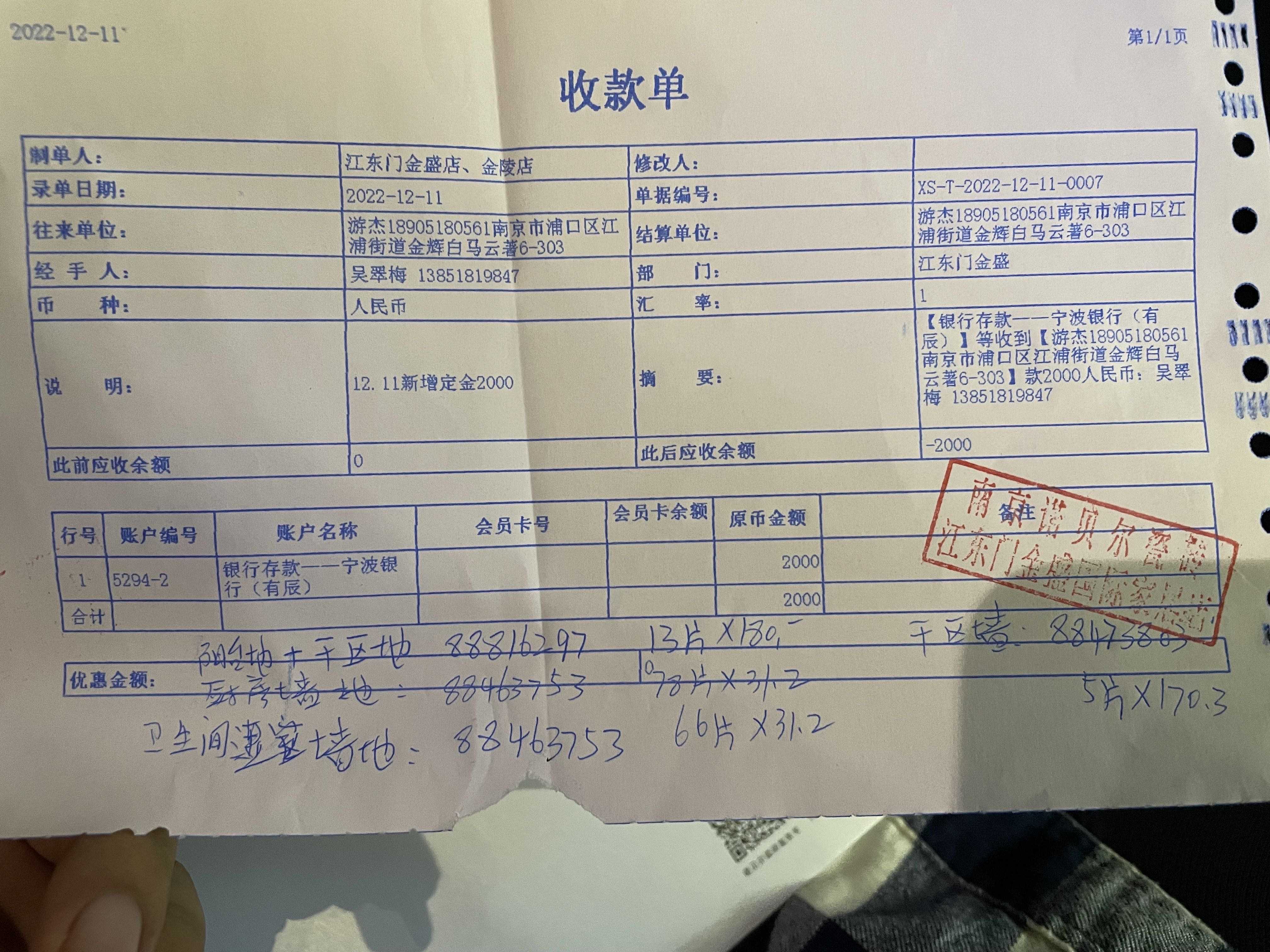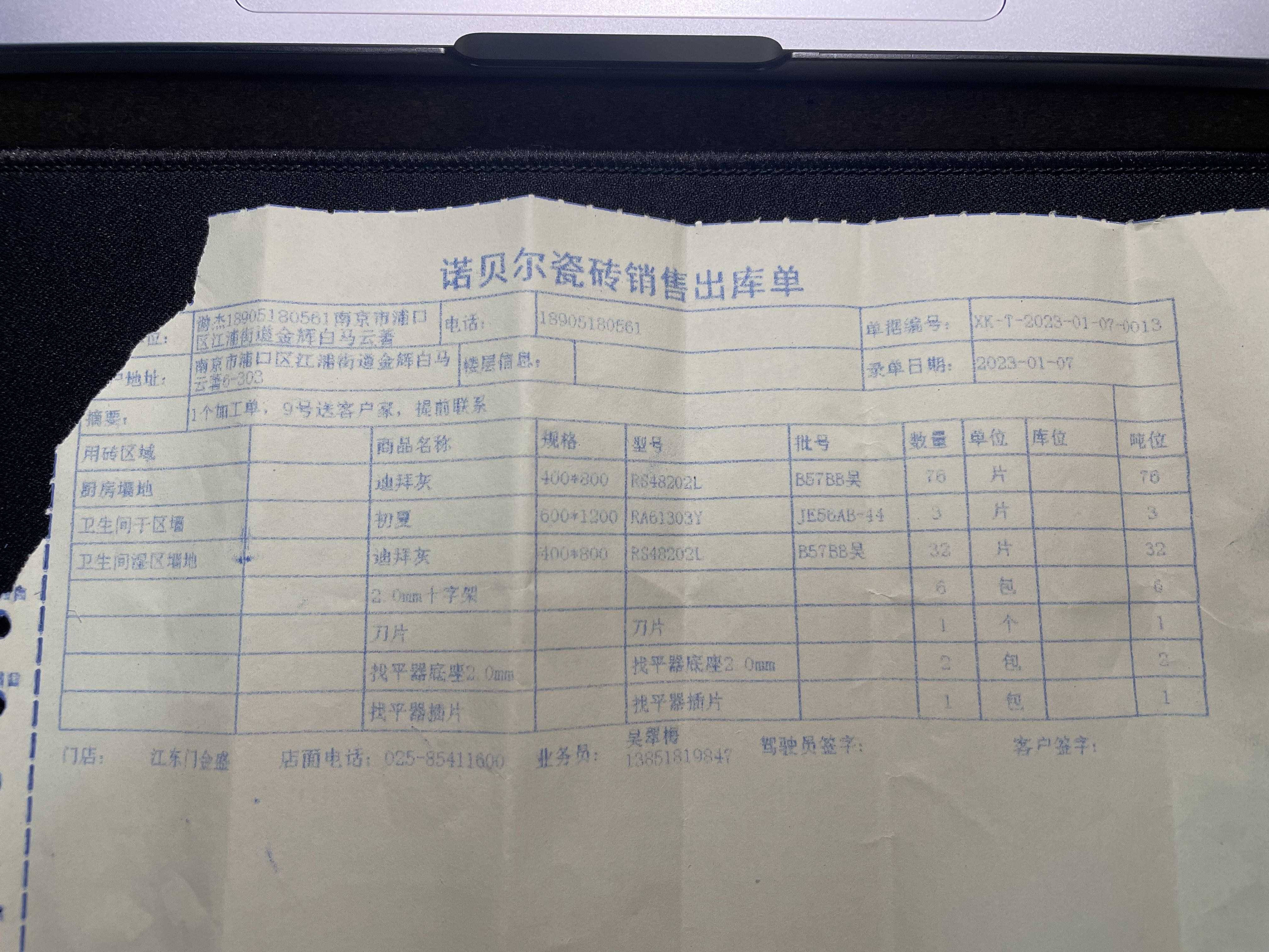 本人在诺贝尔南京市建邺区金盛国际家居店,购买一批瓷砖,瓷砖厂家于今年1月7日送达一批瓷砖,在确认数量后交于南京梵澔装饰工程有限公司铺贴。