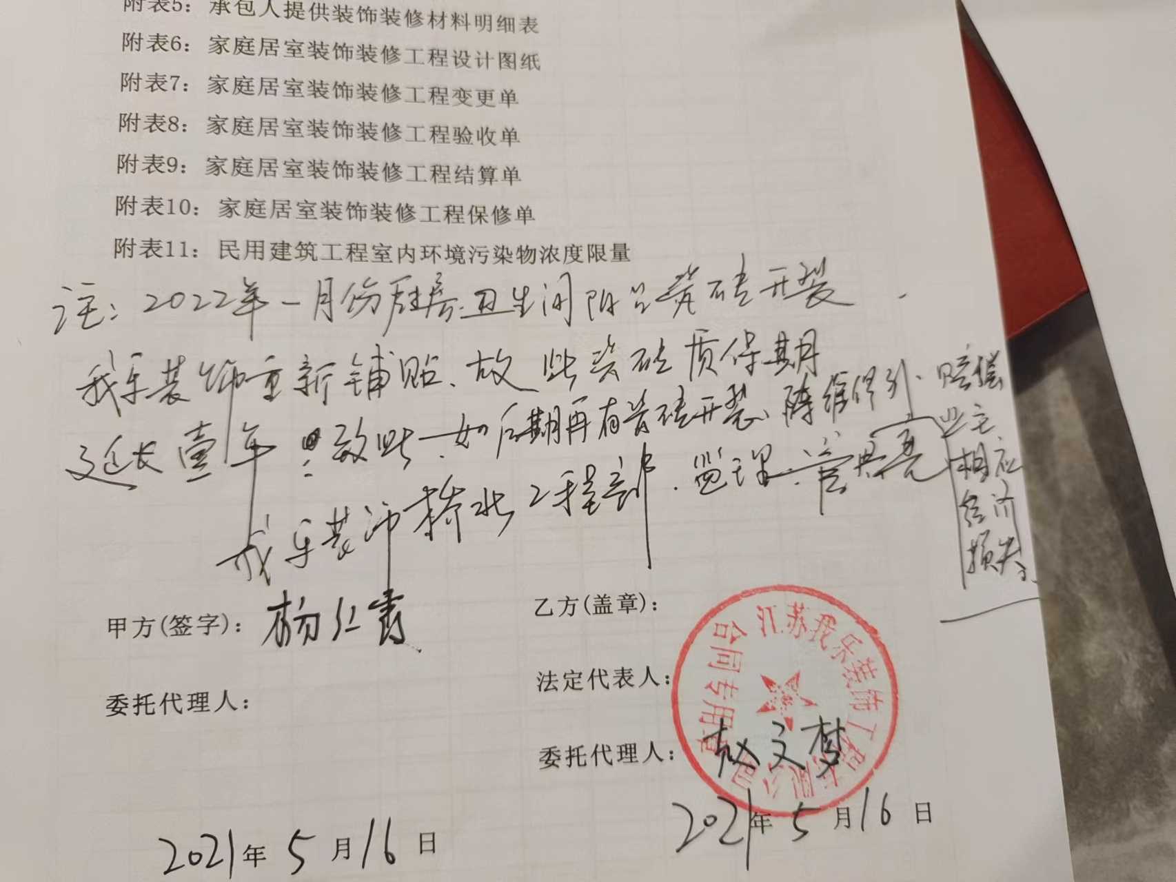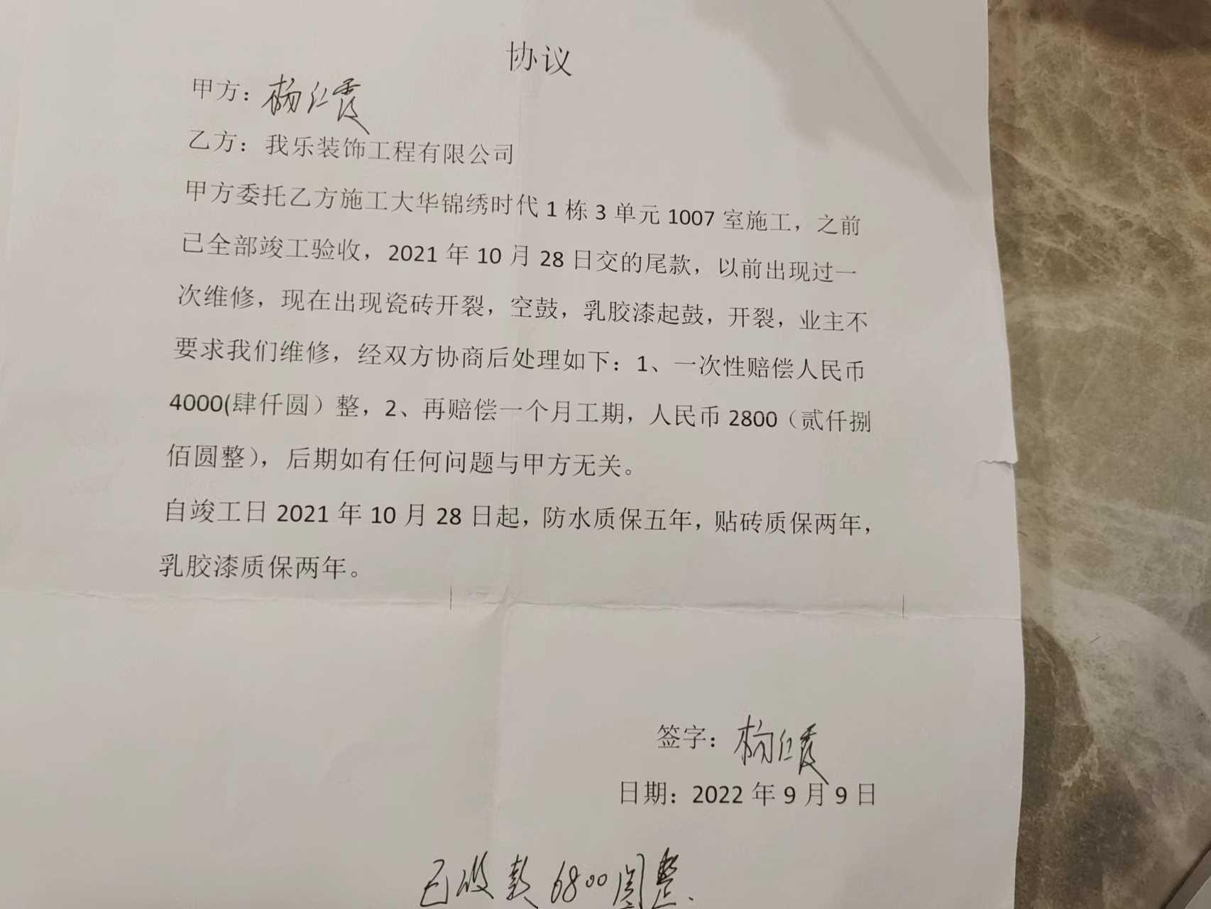 我与2021年5月与我乐装修签订了装修合同,工程与2021年10月28日竣工。合同中规定装修公司提供的材料必须通过甲方验收方可使用,否则造成工程问题全由装修公司承担,每项工程都有工程部监督和验收并在工程结束后我乐要向我提供竣工验收单等等。但我乐完全没有履行合同,由于一些违规操作导致我家卫生间,阳台和厨房多处瓷砖开裂,开裂原因是空鼓导致。事后我和我乐达成和解:他们负责重新铺贴开裂的瓷砖并和我签订了附加条款,如果瓷砖再次开裂,我乐不仅负责维修并赔偿我相应的经济赔偿,对瓷砖质保期延长一年。但是就在2022年8月他们第一次重新铺贴的瓷砖又出现了开裂,而且多出墙面乳胶漆起鼓,开裂,凹凸不平。由于这样的工程质量我已不再相信他们了,于是去公司要求我找第三方负责维修,他们承担费用。由于卫生间不能正常使用,家中多面墙重新刷乳胶漆,我要和家人在外面租房,要求他们承担这项费用。经过多次维权最后和他们达成协议:我乐承担4000元维修费用并赔偿我2800元经济损失。谁知就在2023年1月我乐第一次铺贴的瓷砖出现了第三次开裂,家中多处乳胶漆再次脱落和开裂。至今我乐一直都推卸责任,不给我解决问题。我只是一个普通百姓花几百万买个新房再花几十万装修,真的是挺不容易,但没想到竟然与到这样的装修公司,而且经过这事我感觉普通百姓维权太难了......但我想事情总有解决的方法,所以我希望有关部门能对这样不守诚信的装修公司要监督和管制。