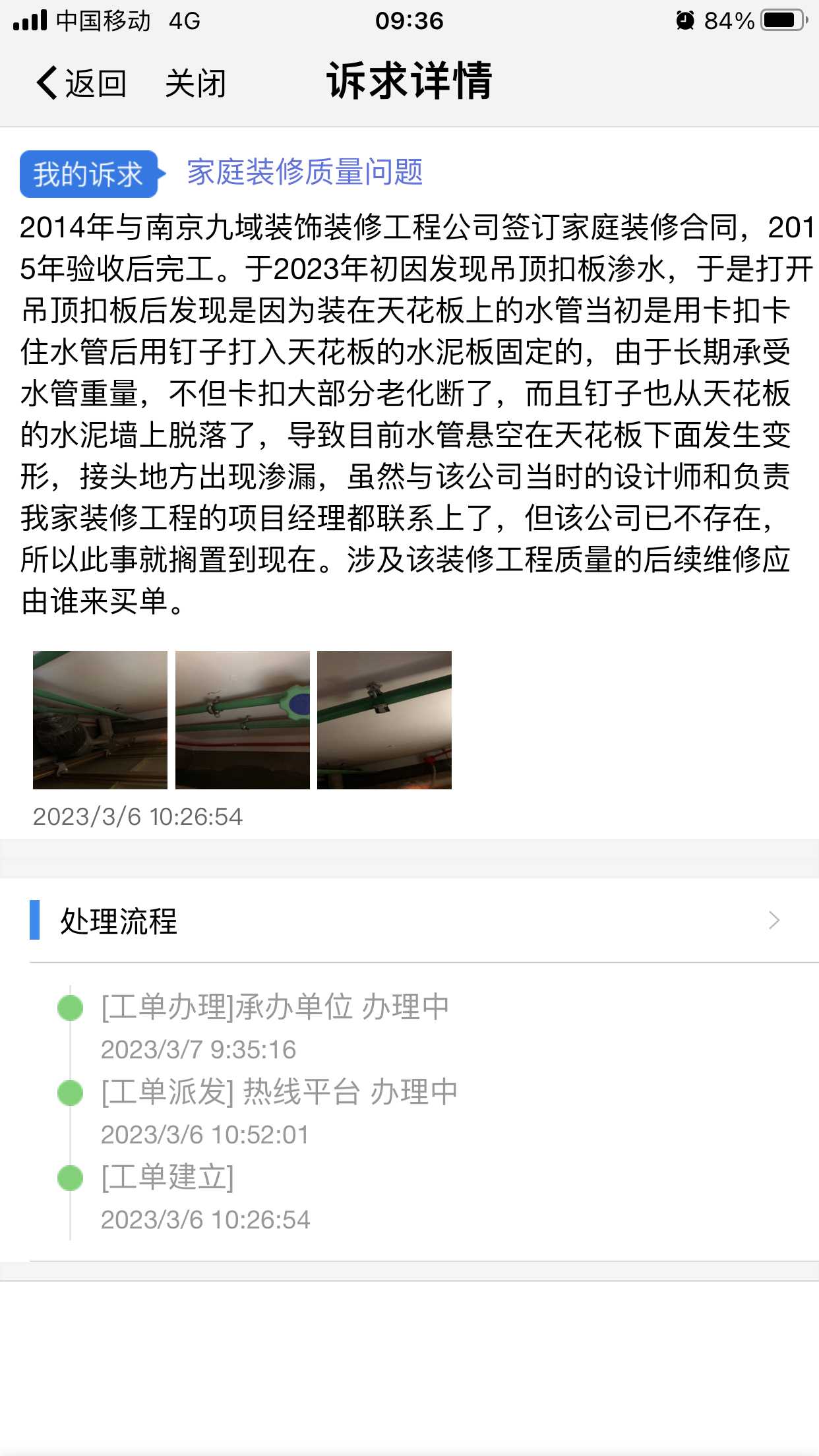 | 投诉类型 | 施工质量 | 投诉人 | 张** | 被投诉单位 | 南京九域装饰工程有限公司 |