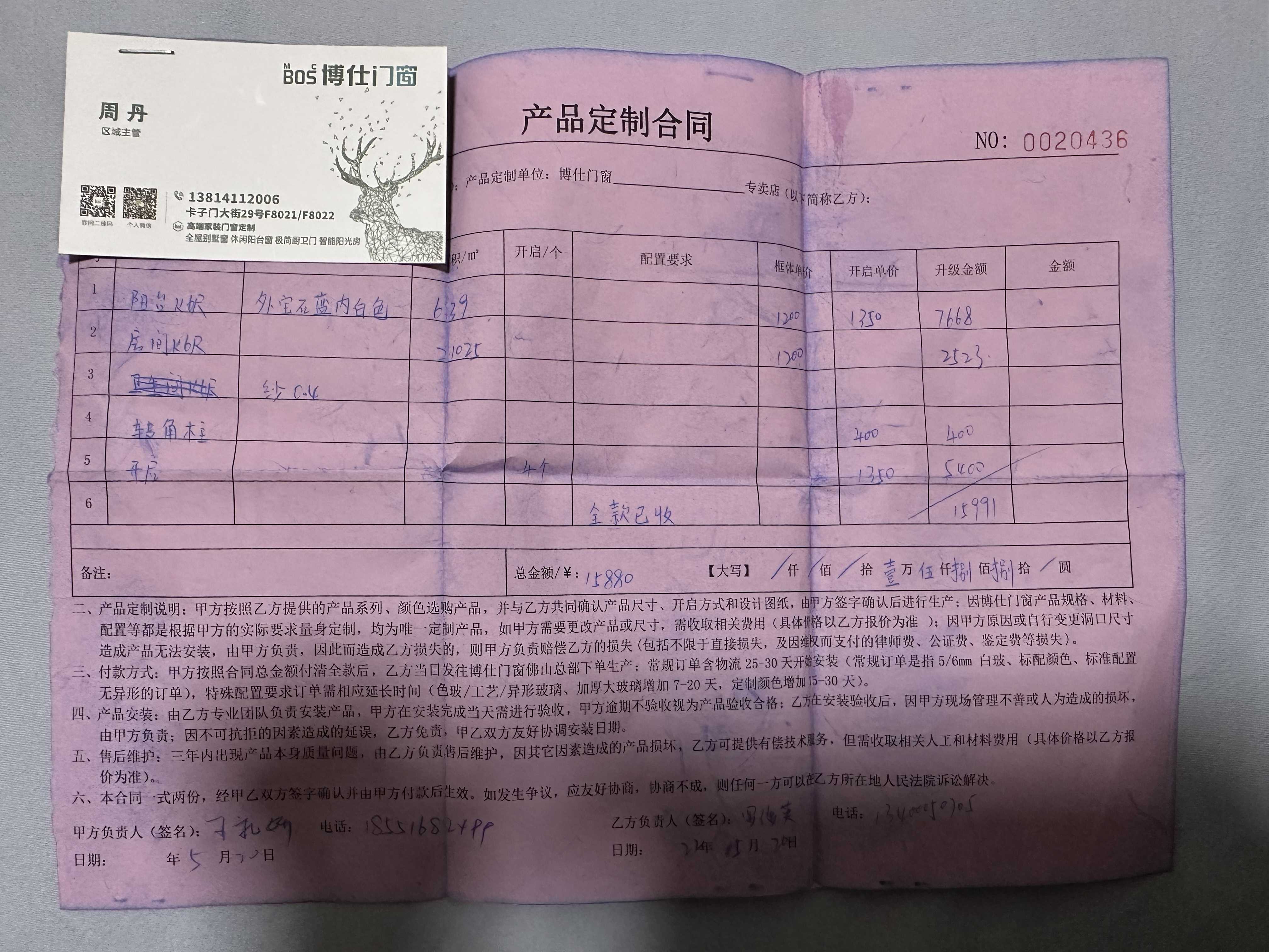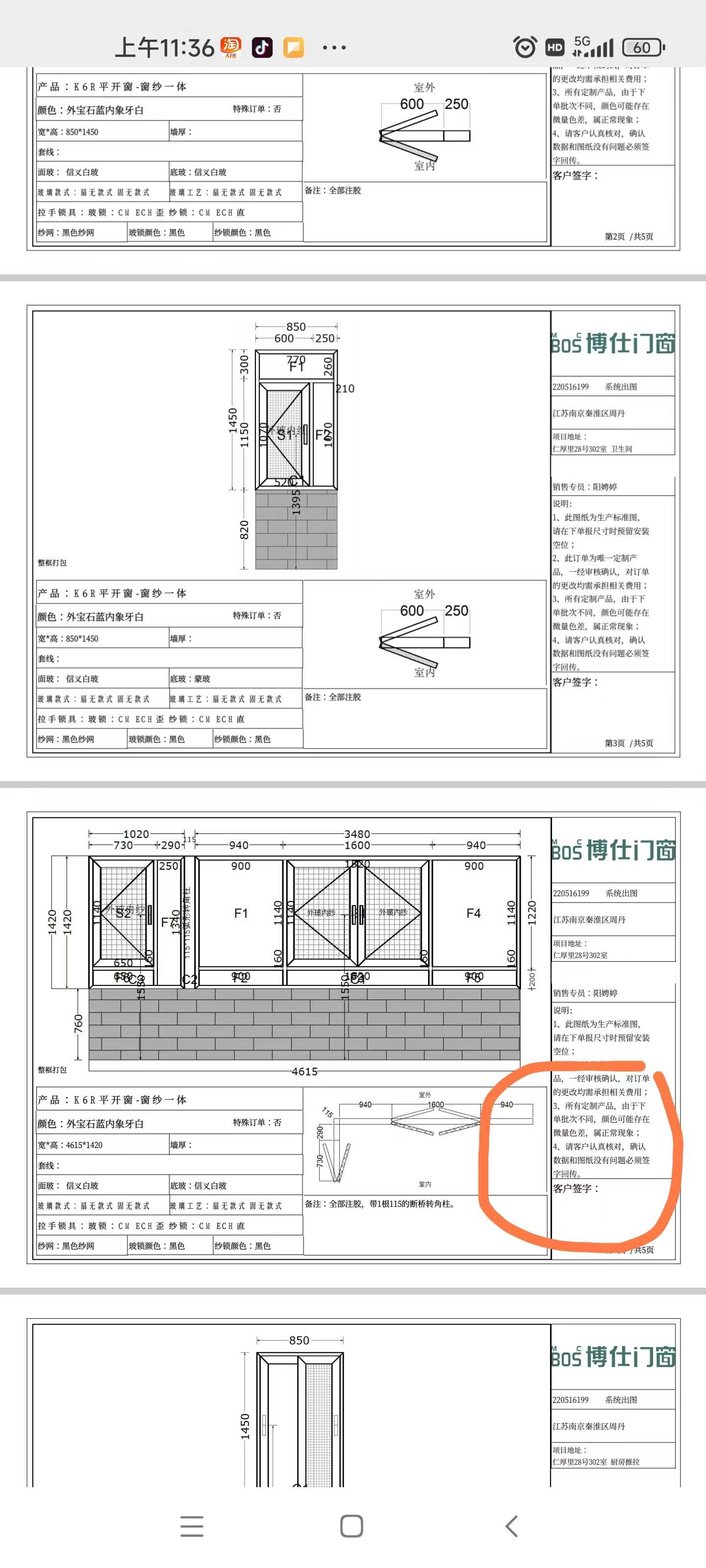 去年5月在博仕门窗店里看上一套系统窗,商家来测量给我一个全屋报价方案。因为价格的缘故,我没有选择全屋,只留了卧室和阳台,并且对于阳台的开扇提出要求(因为靠墙有比较大的水管)。后来又来了个师傅测量,告诉我不能向墙开,需要向街道那侧开。因为当时装修有别的事,中间有二十天没有联系他们。再打电话给他们要求复尺,告诉我已经做好了。目前是开扇错误,窗户很难打开。款式和我在店里看的完全不同。设计图旁边有需要客户签字回传,我并没有签字,也不知道他们已经下单制作。