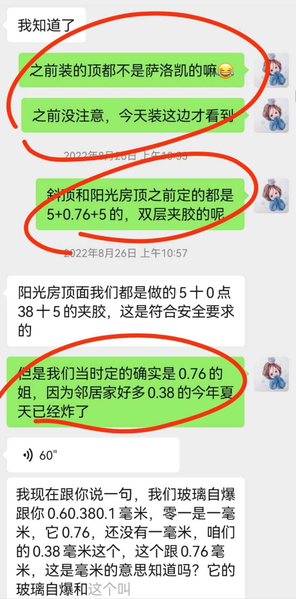 消费者反馈:聊天记录上都是系统阳光房,也有施工图纸,签订合同也是系统阳光房,怎么可能同意一个阳光房二种不同的材质。 | 2023-03-15 |