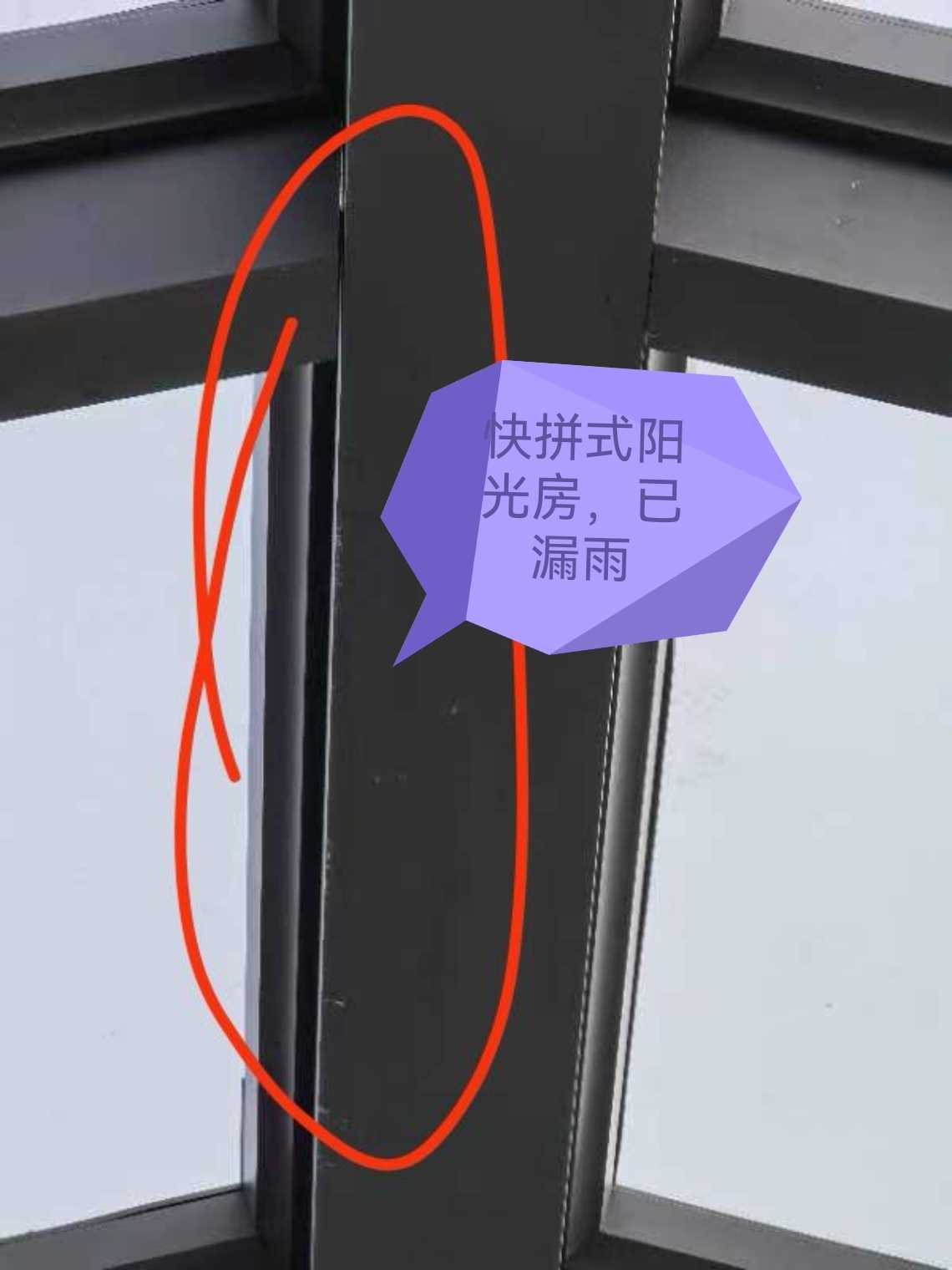 2.安装好后,我家陆续发现阳光房漏水问题,后经了解发现,阳光房顶并非萨洛凯品牌,经与商家沟通,商家遮掩说,质量与萨洛凯一致,只是省了一个萨洛凯运费,出于对商家的信任,我们信以为真,以为质量确实是一样的,并未作过多揣测。