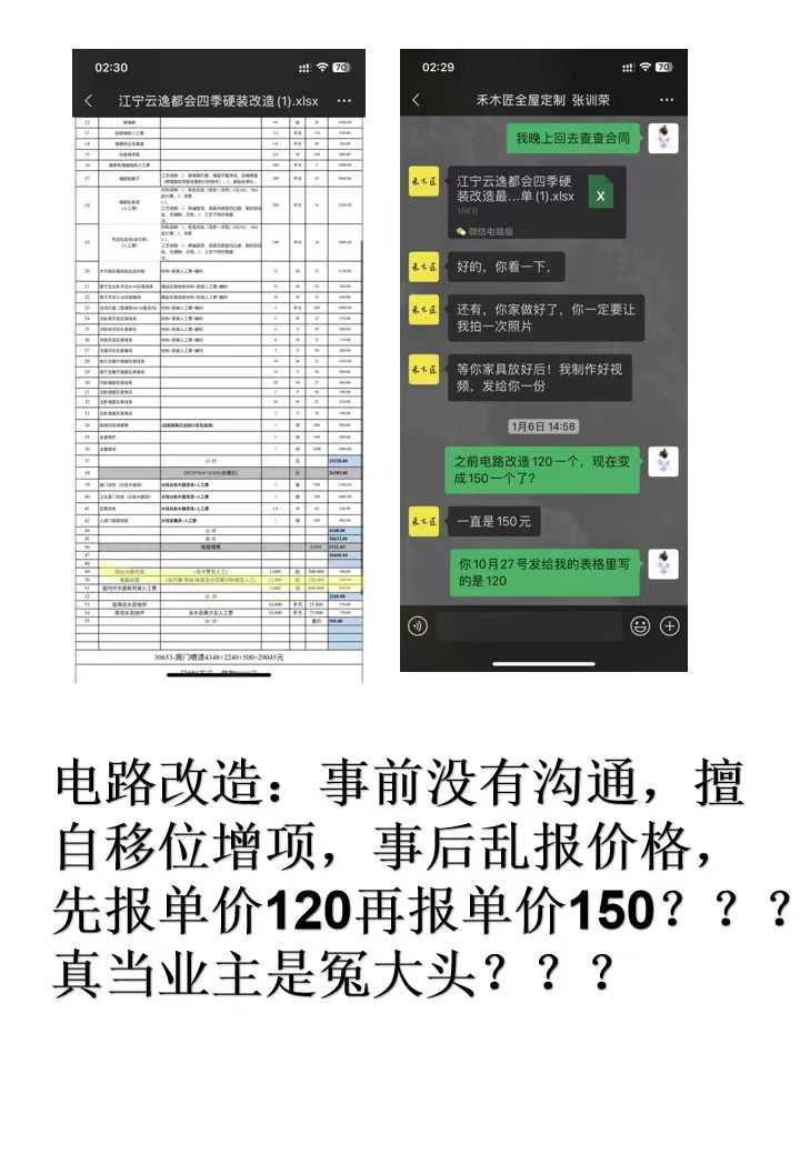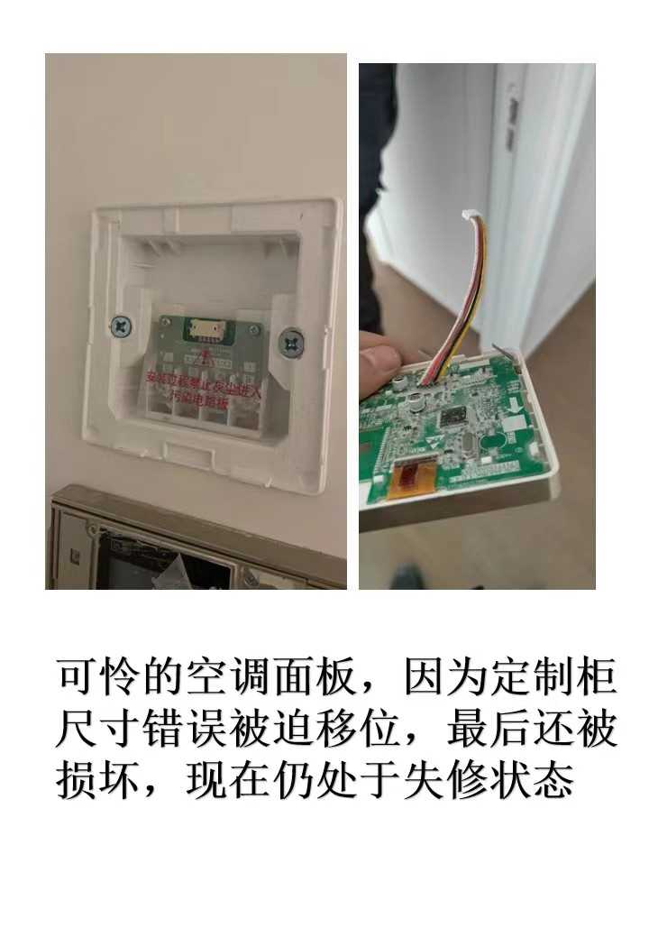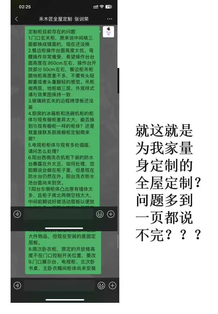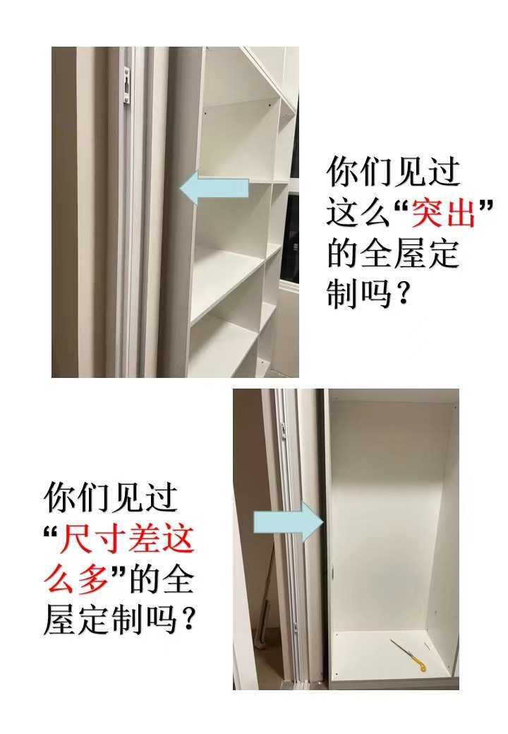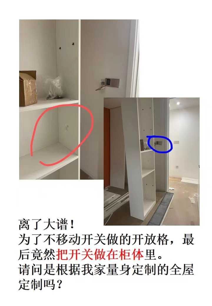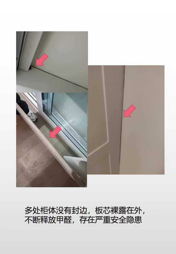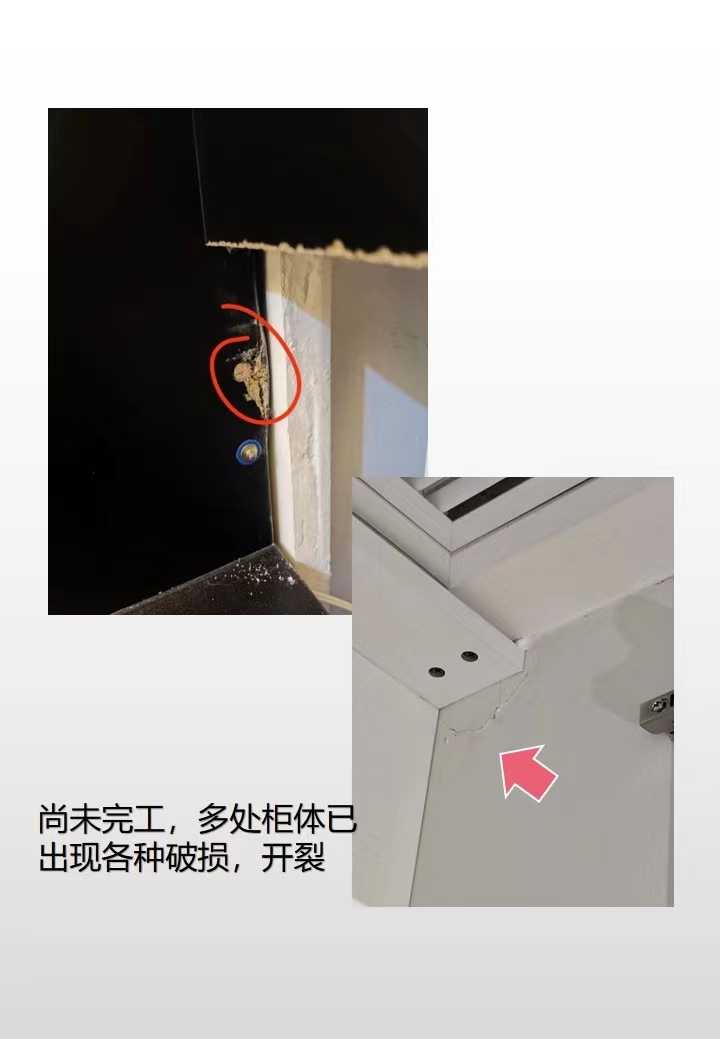 3.全屋定制柜问题百出。柜体质量极差,我购买的是大亚E0级颗粒板,但是板材到我家没有产品包装,没有新板材贴膜,没有品牌标识。餐边柜尚未使用就已出现坑洞,书房悬浮桌拼接而成且没有金属支架,承重堪忧,存在安全隐患。全屋2.4的顶天立地柜,黑心禾木匠为了降低成本,一根拉直器都没有。本应根据我家尺寸量身定制的柜子,出现了各种尺寸不对,装不上,有的柜子凸出来,有的柜子尺寸不够,最离谱的是为了不移动灯光开关,特地定制的开放格,最终开放格位置也不在灯光开关处,还是需要改动开关,同时改动开关还砸穿了原有墙体。为何本应根据我家量身定制的柜子,尺寸各种不对?