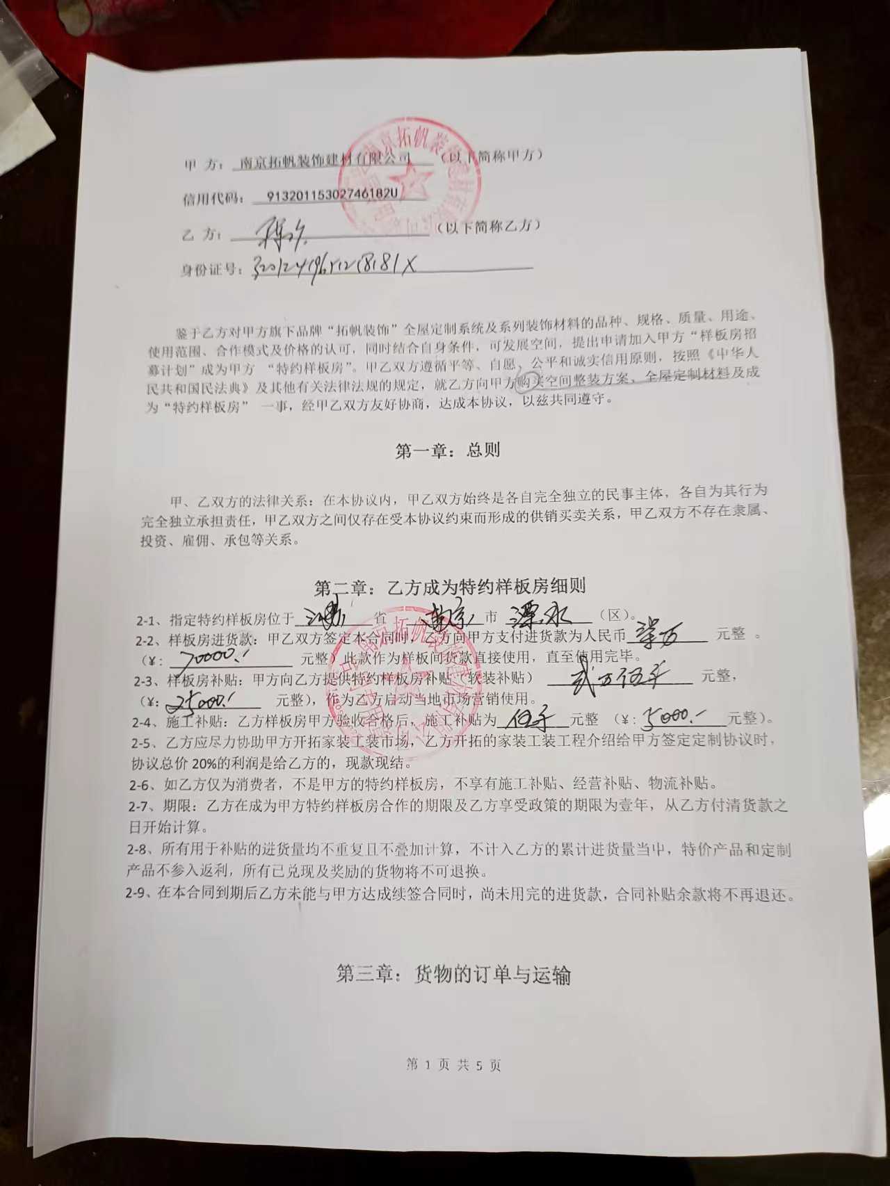 我是在抖音上发现南京拓帆装饰建材有限公司的广告的 他们的宣传的是120平方房子59800包整装 于是我去他们公司谈了 当时也看了他们的样板间 当天我就交了五千块钱签了给我做样板房预留协议 后来也谈了几次说好了我把水电做好交给他们 他们把房子整装好交给我 期间他们来过两个设计师量房和做效果图 最后我们谈好了90平方套内面积承包价是70000块钱 当天到快下班的时候匆忙中交了五万预付款 那个什么李总翻着协议在我没机会没时间看内容的情况下让我签了这份协议 当时那个李总的签名我到现在也看不清 还有他留的电话也明显不对(这是我当晚联系不上他直到第二天才发现的 而且他改了几次都不对) 可我万万想不到他们这么大实体公司做生意是这种套路 晚上回到家我忙完后仔细看了下协议内容 可里面完全不是我们讲的那样 协议里我成了他们的经销商了 我当即跟那个黄龙总监联系 可他到第二天中午没有回复于是我又去了他们公司 我本以为是友好协商 补充一下就可以了 可他们公司接连来了几个人 改口说不是全包 说还需要我来出工人 出材料这些之前到协议从没有提到过的要求 我说他们说话不算话要求解除协议 可他们要求我要么加36000继续做 要么付违约金15000 我报警 警察喊他协调他不愿 我至今十多天已经经过几番周折才到了这里投诉 他们拿了我五万五千块十几天了到现在没人理会 今天下午倒是有个什么徐经理联系我了 可还是坚持要我付违约金什么的一万多 可我认为这不是我违约 是你们不诚信才导致我不敢跟你们合作 我也愿意承担两千块算他们工程师的工资 其余五万三全额退款 可他们坚持要求按协议办 故我请求相关部门给我解决 谢谢!
