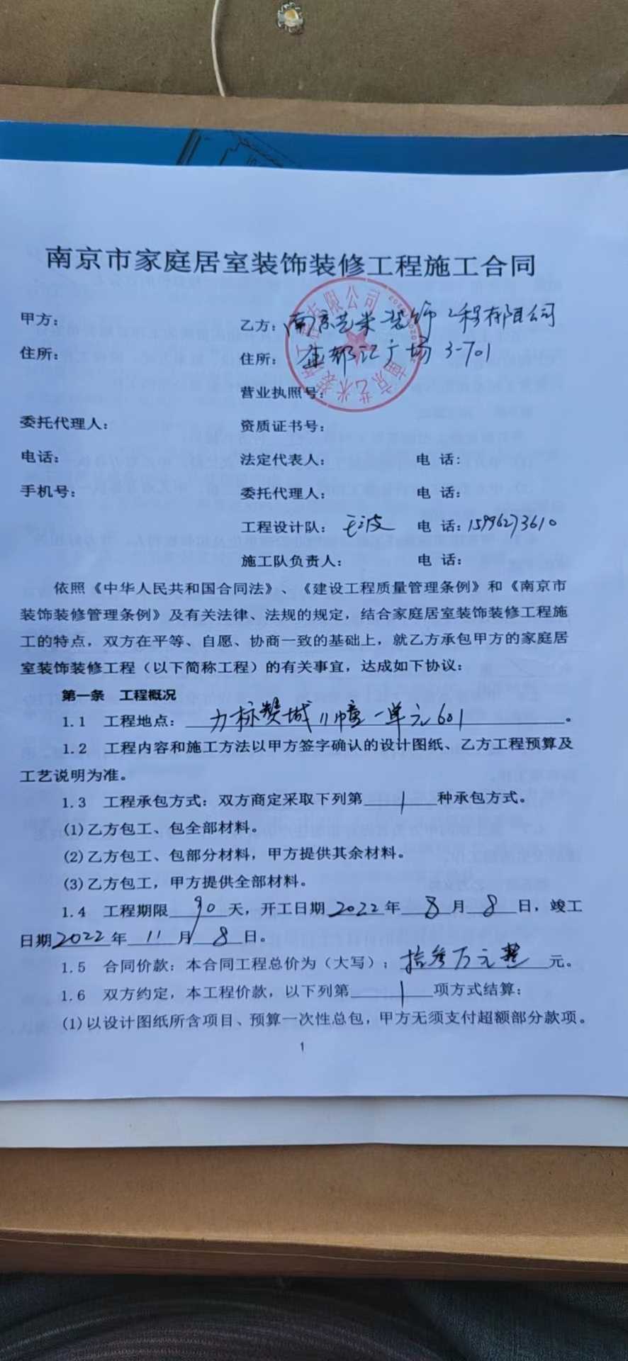 南京艺米装饰工程有限公司自去年8月8日签订装修合同,合同截止装修日期2022.11.8为期90天,前期进度没有问题,自2022.11.8日之后开始延期,至今没有任何进度,电话各种沟通催促,始终没有进度。