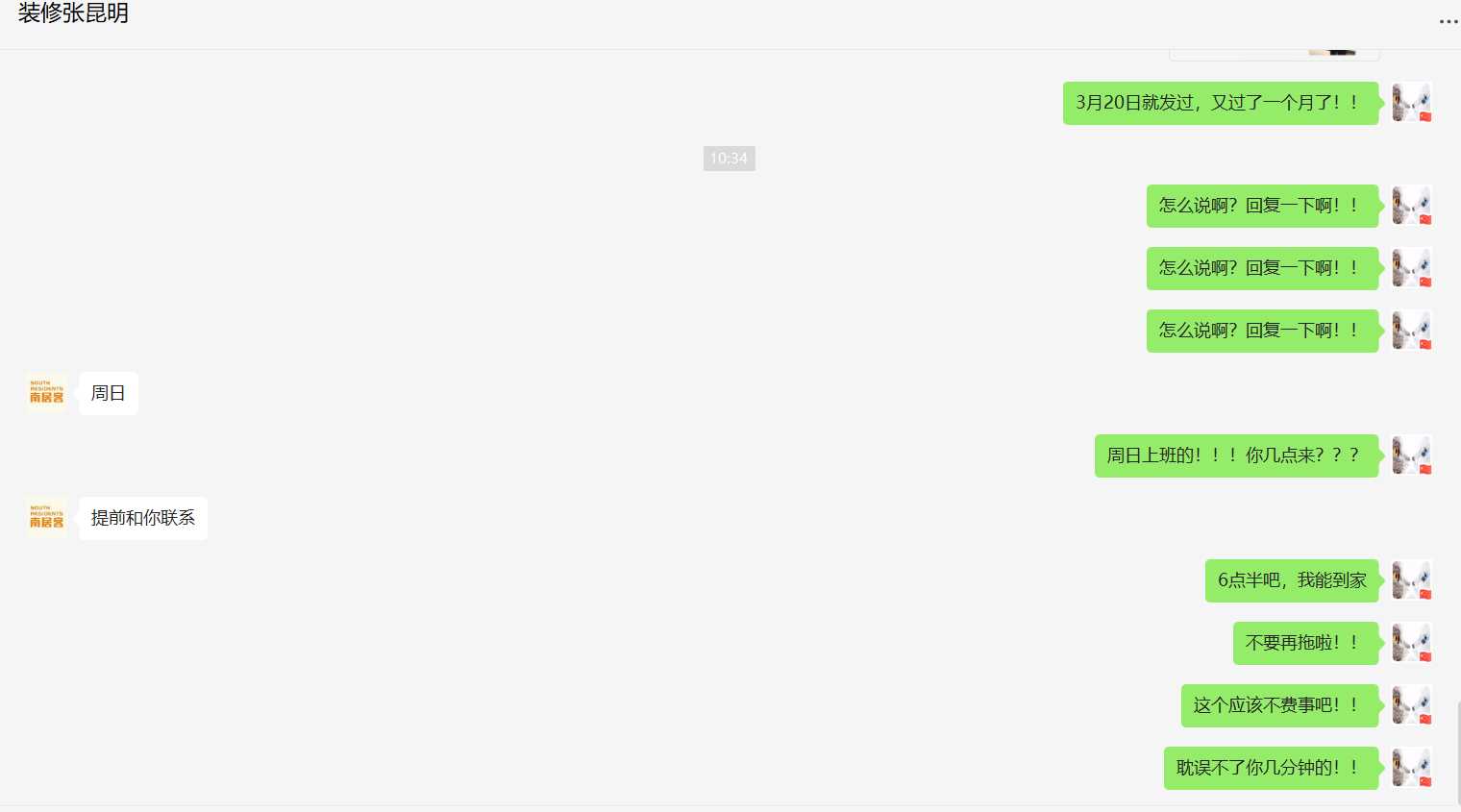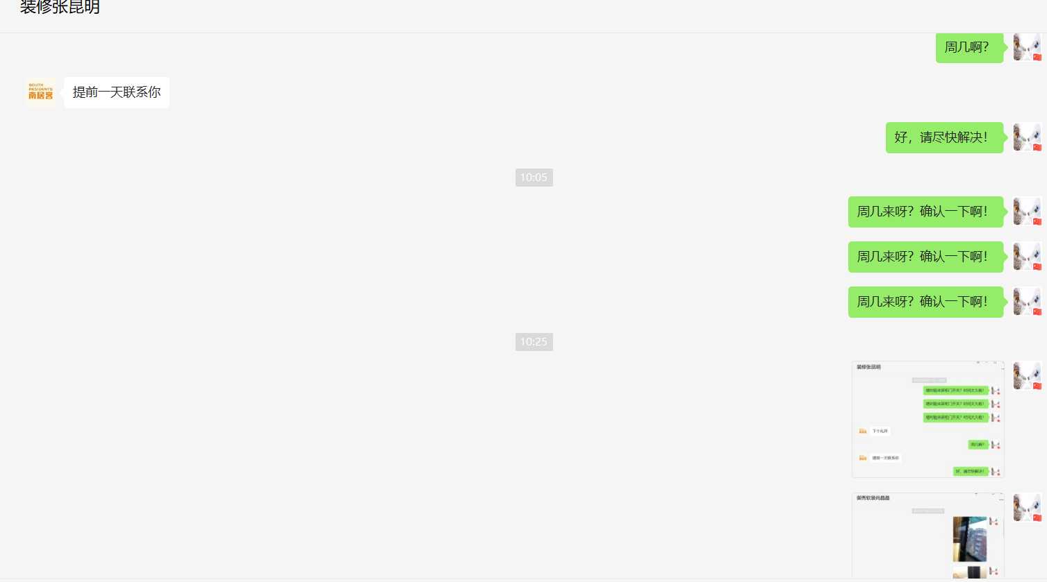 该投诉为重复投诉,已经第三次。几天前约好周日处理【正好五一劳动节调整上班】,又没约上。消费者晚上18:30下班到家,约装修公司上门处理。装修公司回复会尽量调配时间。如果处理未果,消费者会再次来电。 | 2023-04-23 |