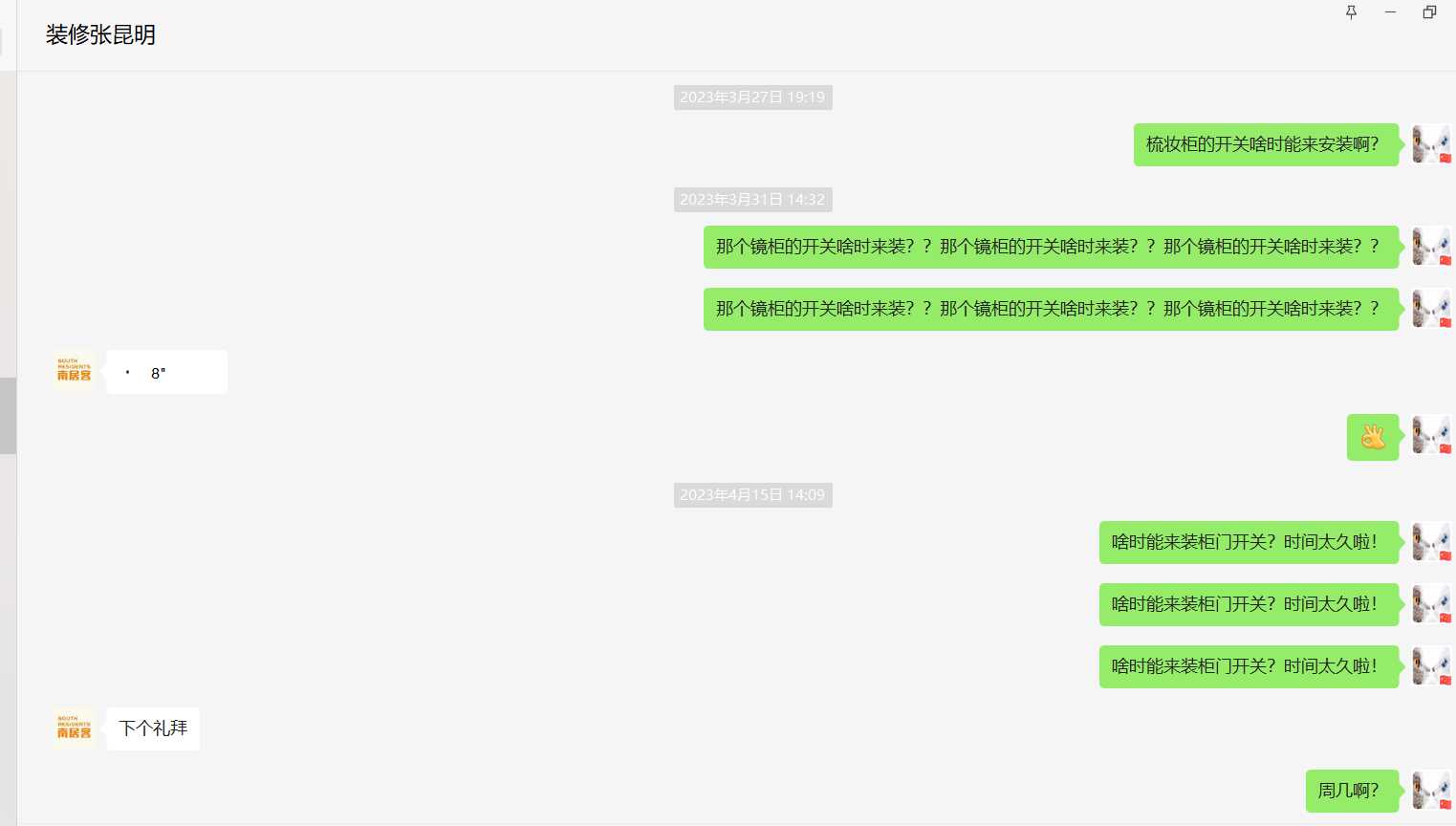 2022年4月1日开始装修,2022年9月4日装修结束,装修款共计11万4千元,已全部结清。装修结束后,发现大量问题。如门口油漆未补,洗手台未打胶,洗手台台盘脱落,镜柜未安装全门及未安装柜门开关。自9月份以来每周打电话进,微信进行沟通,均次次未果,一直拖延。后无奈,报12315平台,家装维权网等平台进行处理。可查阅相关投诉记录!后续法人张昆明陆续过来进行了相关处理。但到目前为止,镜柜门开关依旧未安装,法人张昆明用透明胶带的方式进行了镜柜开关代替处理,从2023年3月20日一直到今天(2023年4月20日),一直均未上门进行镜柜开关安装,使得我们用户使用了一个月的胶带进行柜门开关动作。花了十几万,就这个装修效果,实在让人大丢眼镜。同时在一个月的反复沟通中,法人张昆明均以忘记了,要去上坟等理由进行搪塞,拖延,迟迟不确认上门处理时间,缺乏最基本的经商诚信!!现要求法人张昆明明确上门时间,尽快上门处理,给消费者满意的处理结果 !