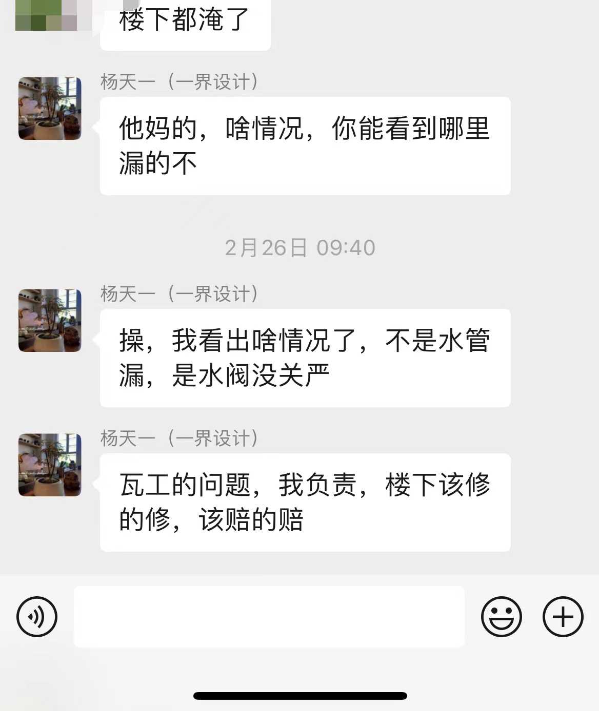 消费者来电,装修公司拒绝漏水导致的楼下赔偿问题。 协调失败。 | 2023-04-25 |
