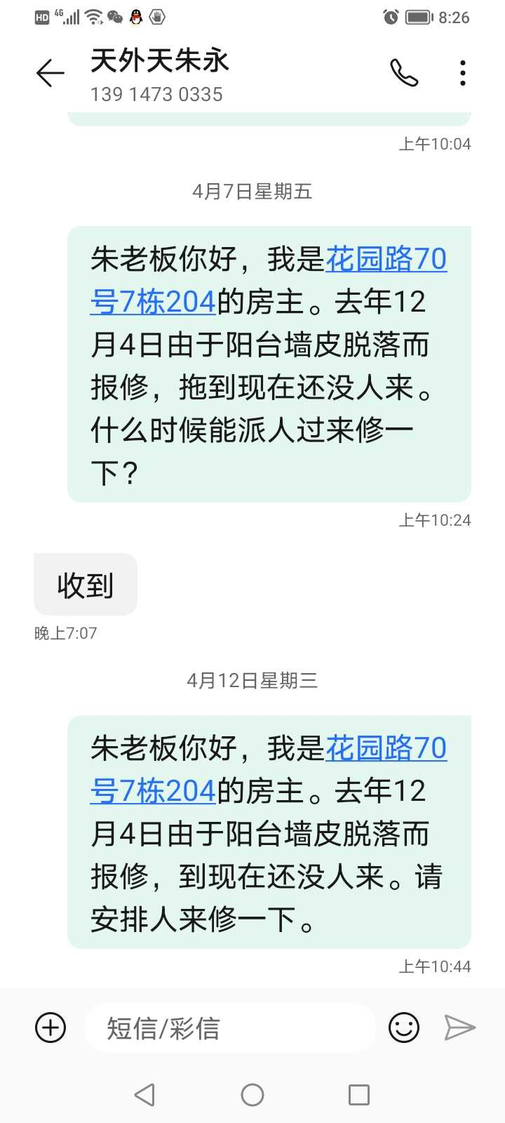 我在天外天装饰设计工程有限公司,2021年2月份装修结束,装修了房子。去年12月4日,由于墙皮脱落,向该公司报修,是在保修期内的。该公司老板朱永一直在推诿,不肯派人来维修,最近电话都不接了。