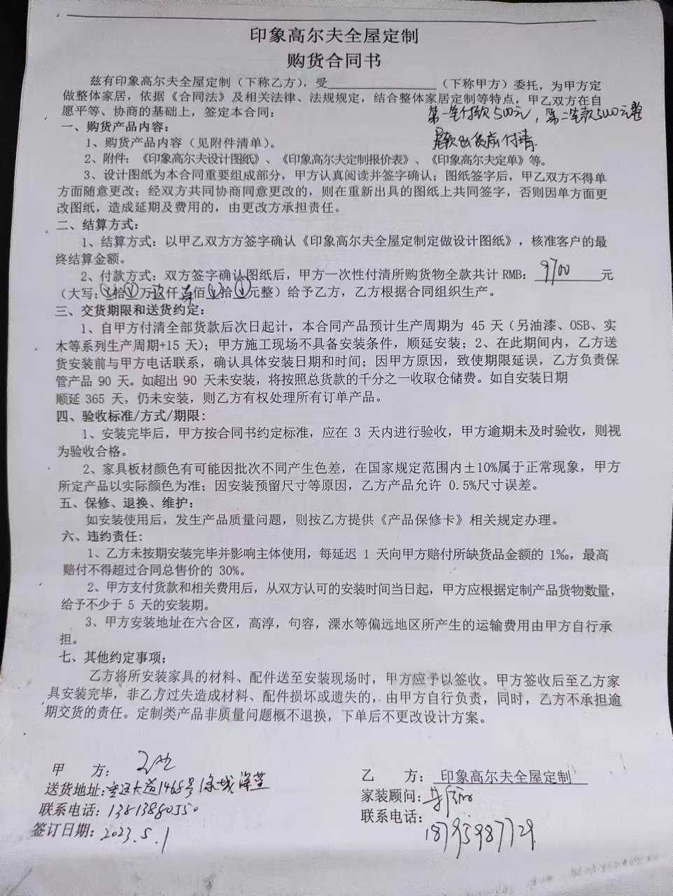 本人于2023年5月1日在金宝装饰城(莱茵达路99号)的印象高尔夫签订背景墙制作与施工合同,交了5500块钱,现商家拒绝按照合同履约,且不肯退钱。