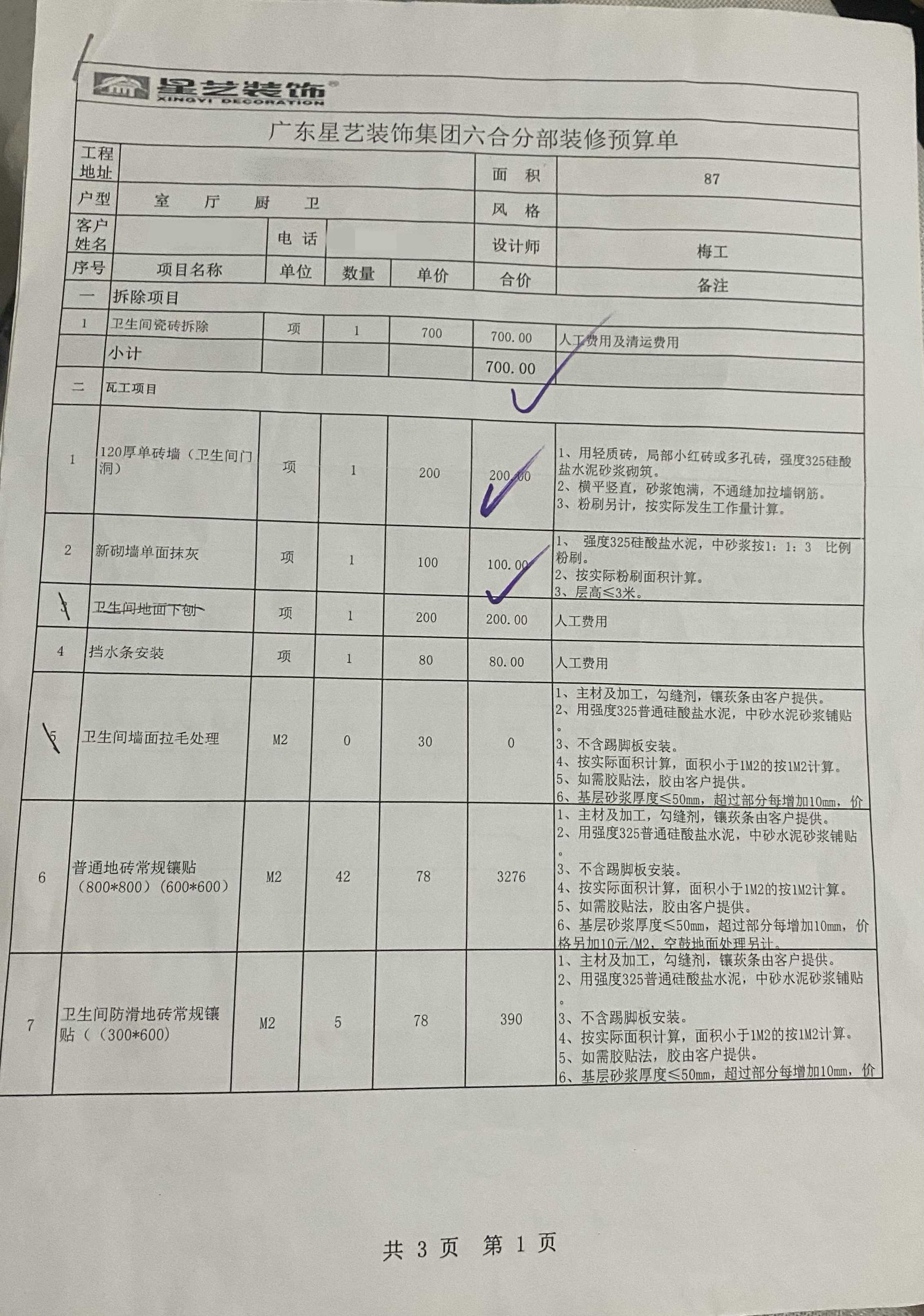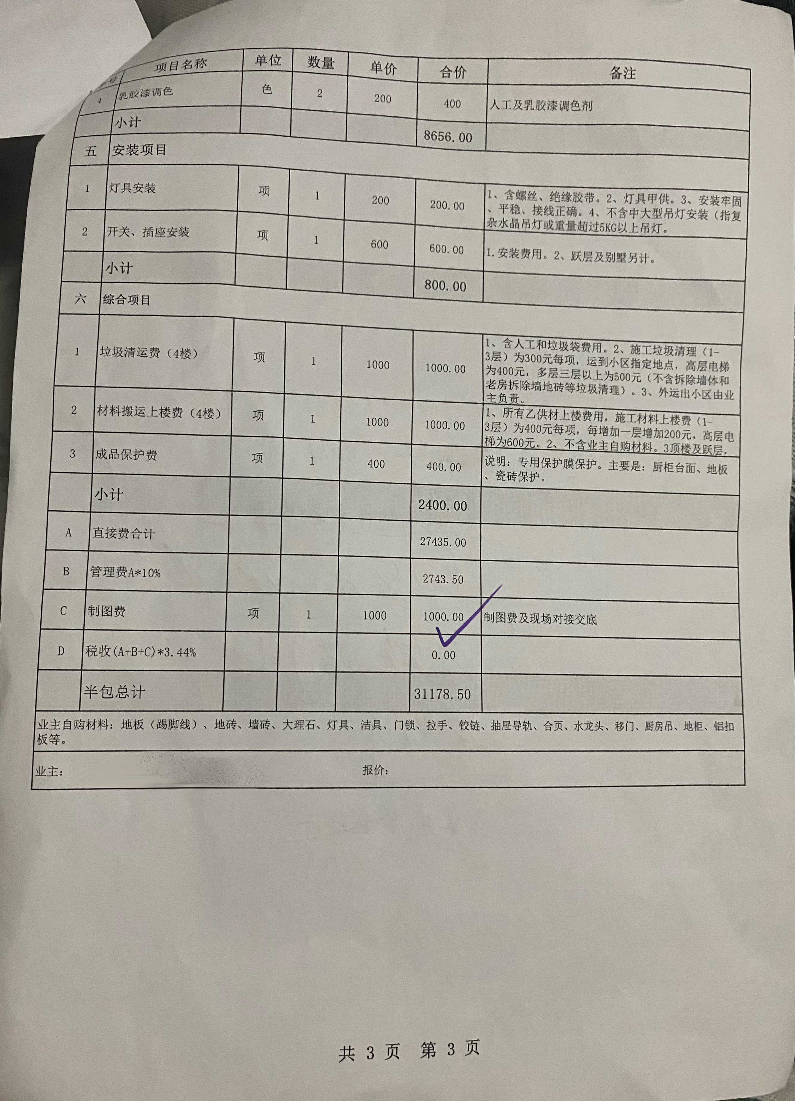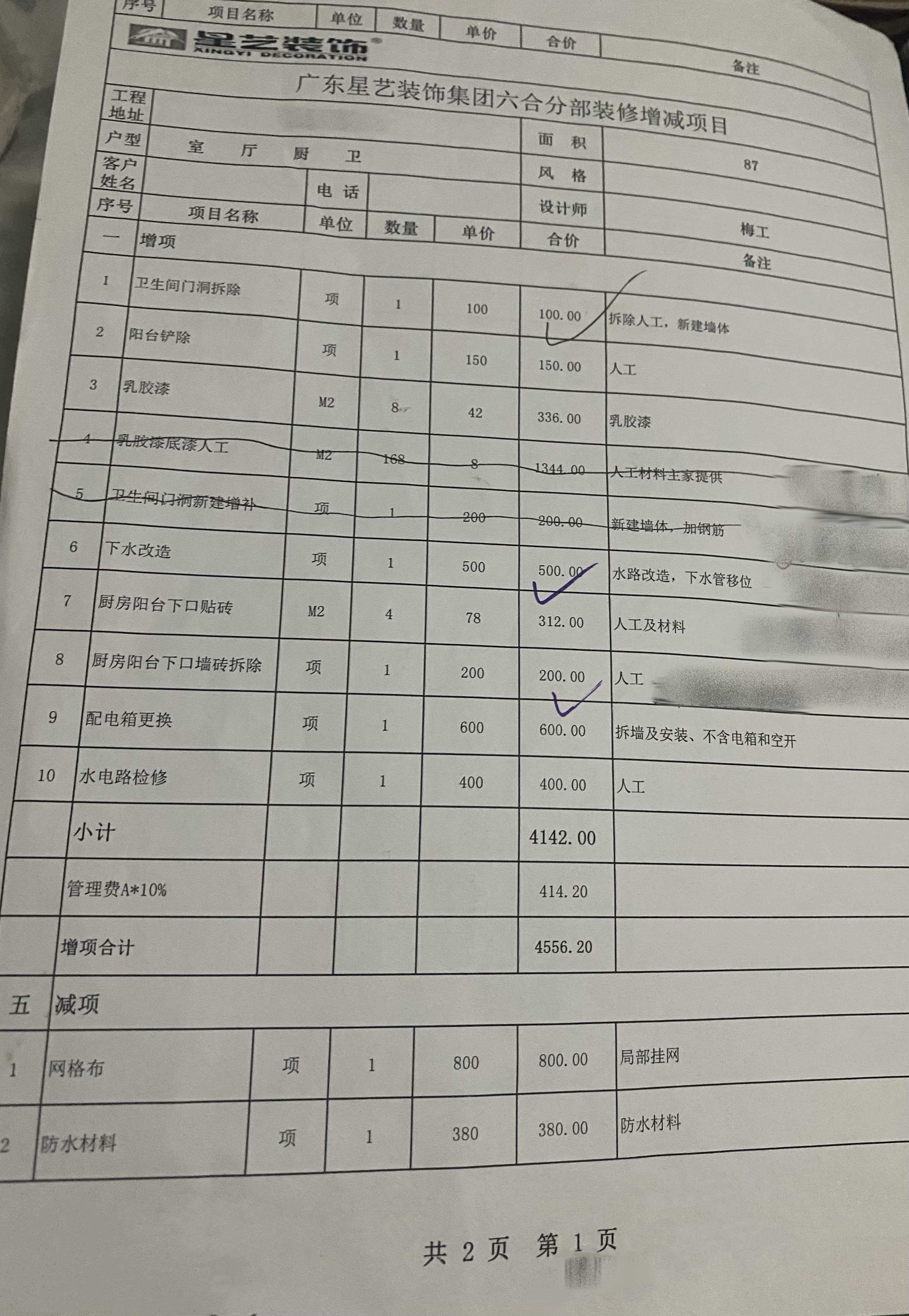 装修一直拖着!公司无人给合理说法。这种情况下 最后给的“已做项目清单”里 居然还有 管理费670元!垃圾费400元!厨房下水维修300元!拆除费600元!(拆除指的是上一个项目经理在没测压的情况下 就把卫生间后移的水管部分抹上了水泥 造成需要返工这部分)