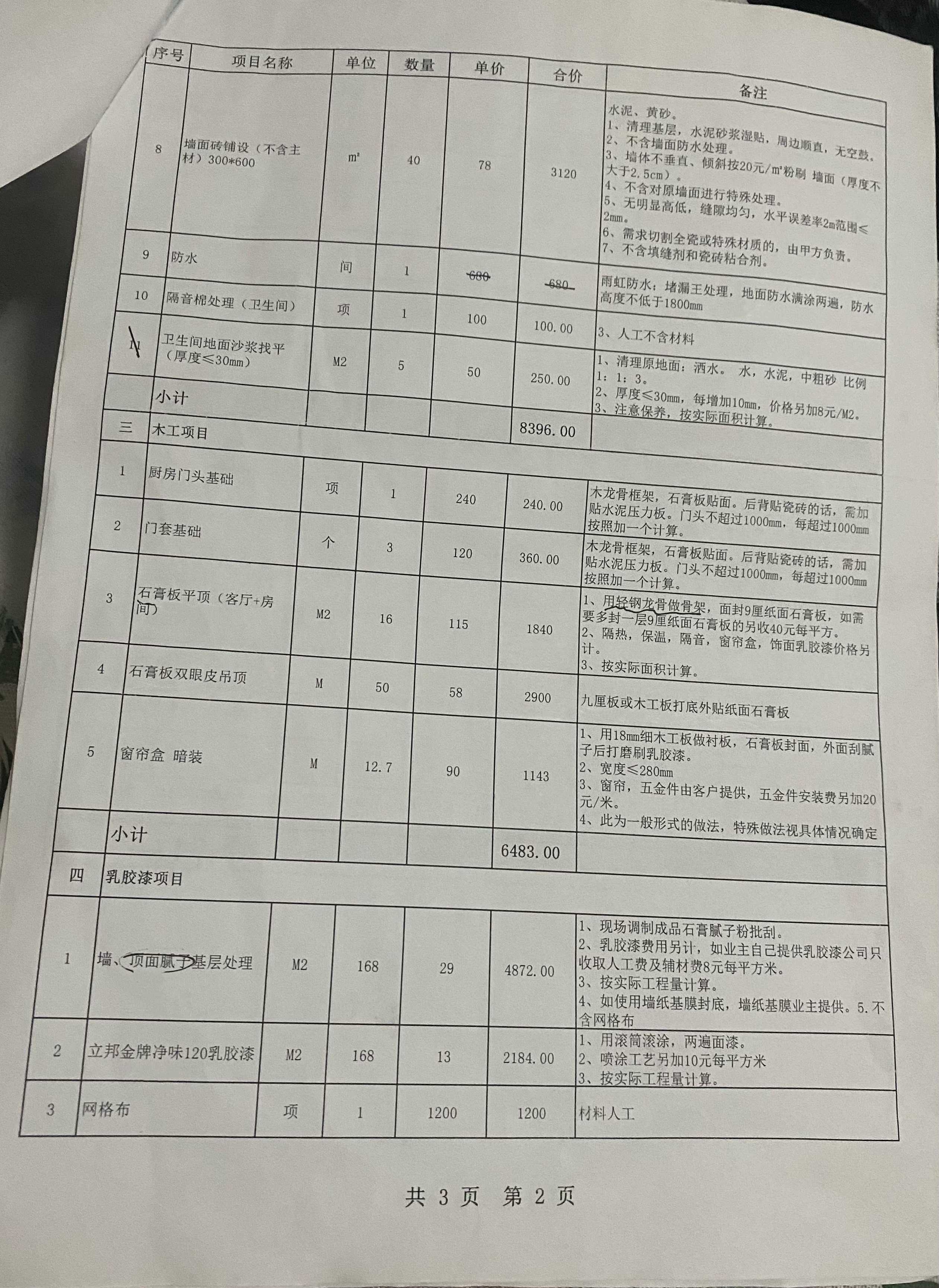 到现在为止装修1/3进度的一半都没有,卫生间防水,瓦工 木工 油漆工没一样完成。 4月20日开工时就要求我们付了首次工程款13690元(包含1000元制图费)装修总金额29200元。签合同时是约定好了要做的项目,有明细的。开工后项目经理答应给房子抹水泥的地方故意不抹,耽误久了就当作增项要收费!影响了后面进程。第一天动工震动到厨房下水管造成渗水,一再强调修理费用!未同意,项目经理以各种理由动不动就不愿意干了。卫生间后移的水管没有做测压,就让工人用水泥抹上了。造成了后面返工。